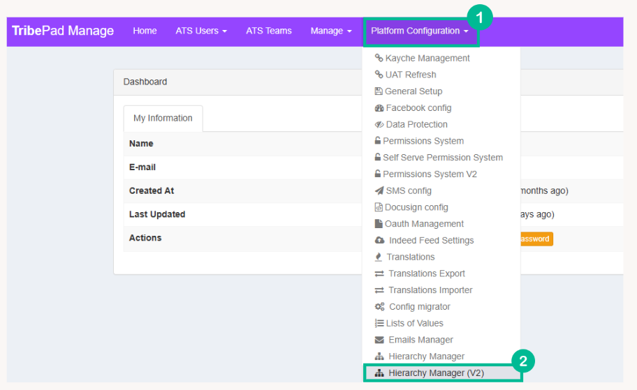 You can access the V2 Hierarchy Manager via our Manage site and in the same way you would with version 1, by first heading to "Platform Configuration" (1) however, instead of selecting ‘Hierarchy Manager’ from the platform configuration drop-down, you need to select ‘Hierarchy Manager V2’ (2) (you may need permissions enabled to see this).