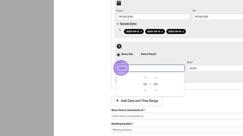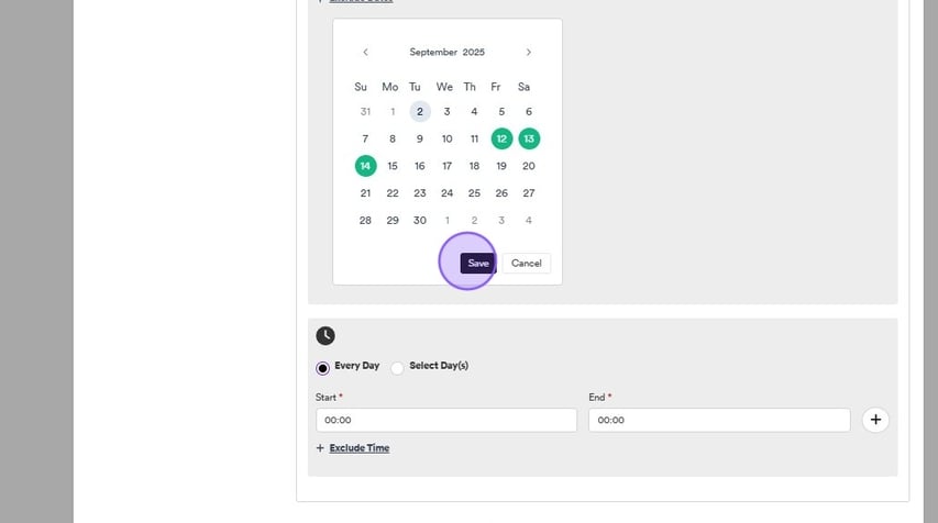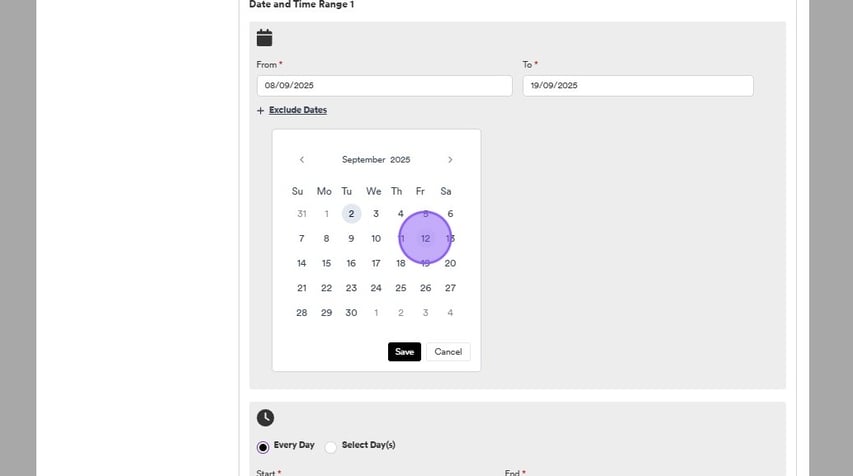 You can also exclude certain times for all of the dates selected. To do this click on one of the following check boxes relevant to you, either "every day" or "select day". Followed by clicking inside the "Start" box to select a time.