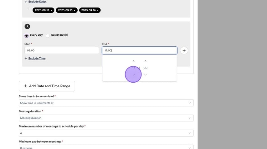 To set your end time, repeat the steps by clicking on the "End" drop-down, and select the appropriate time.
