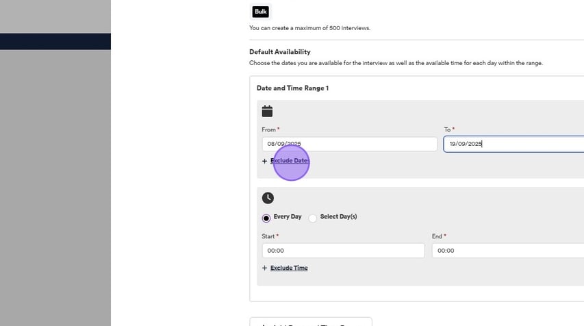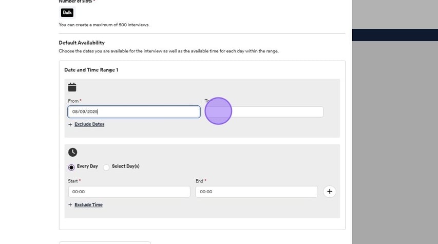 On the ‘Date and Time’ section, you will notice, much like when you are setting up slots for a candidate to pick from, you are only given the option to set up ‘Bulk’ slots:
