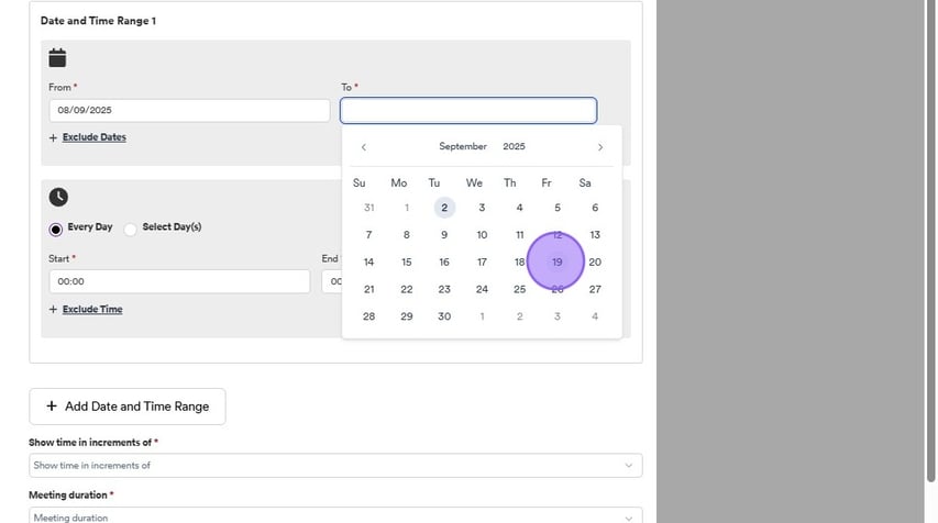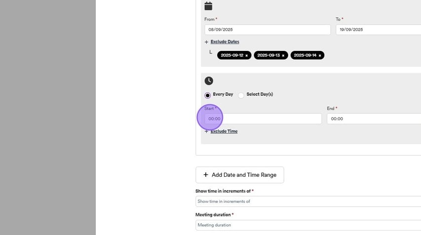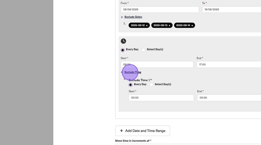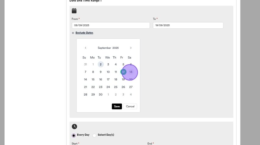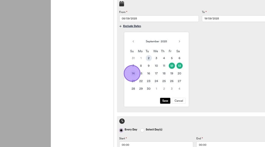 You can also exclude certain times for all of the dates selected. To do this click on one of the following check boxes relevant to you, either "every day" or "select day". Followed by clicking inside the "Start" box to select a time.