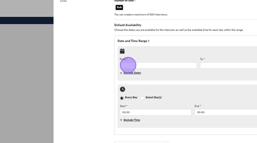 On the ‘Date and Time’ section, you will notice, much like when you are setting up slots for a candidate to pick from, you are only given the option to set up ‘Bulk’ slots:
