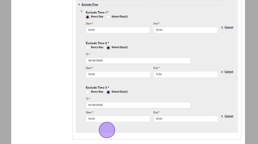 f needed, you can add another time range to exclude by clicking on the "+ Exclude time" text again, as shown below and repeat the steps above to select your additional time range.