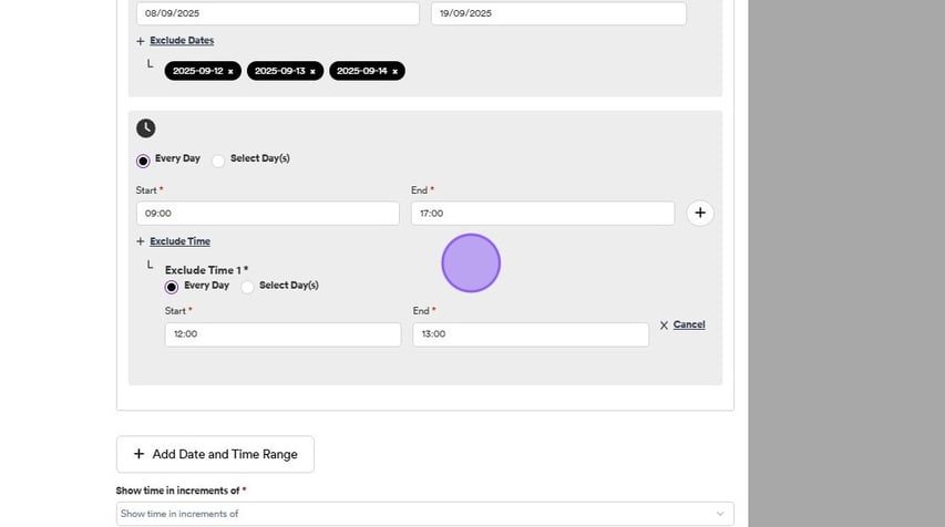 Select the date range you'd like to exclude - In this example we have excluded the 12th, 13th and the 14th of September.