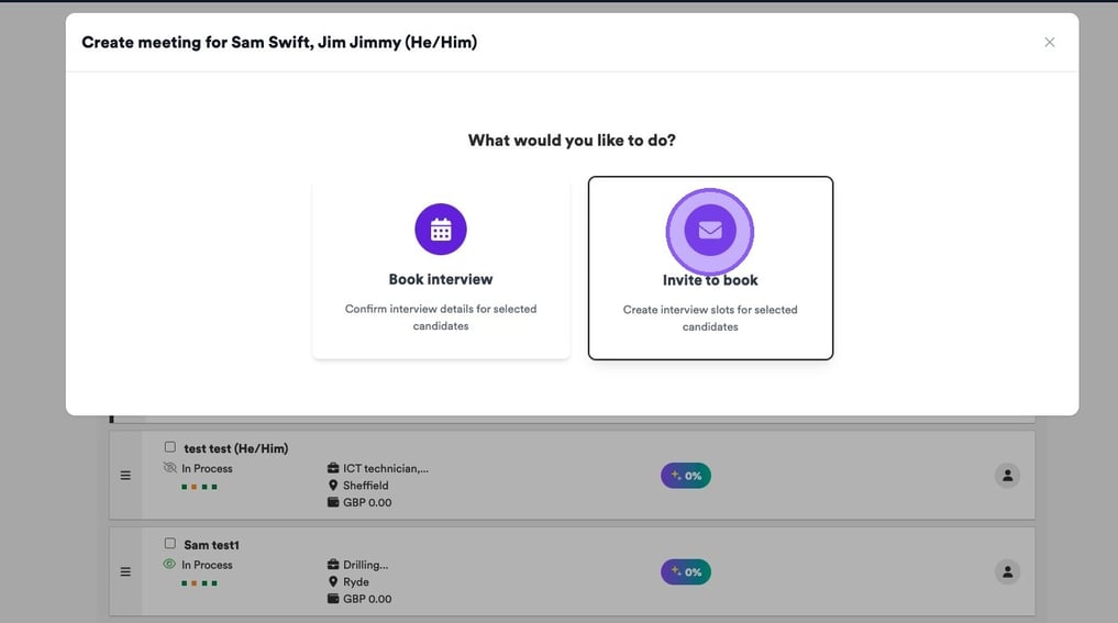 - ‘Invite to Book’ allows you to set up a number of slots for the candidate to then choose from.