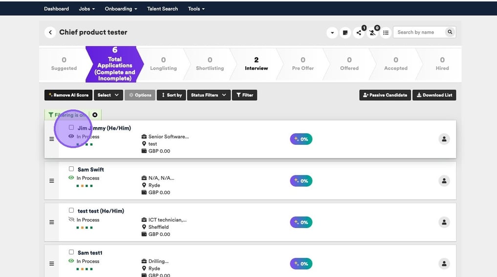 - You will see that the candidate has been moved to the ‘Interview’ bucket, as is the normal process when booking interviews in the ATS: