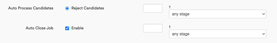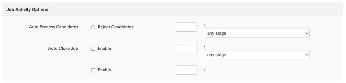 Job activity options is an additional feature that allows you to automate withdrawing or rejecting candidates at a specific recruitment stage of your choice and/or you can choose to automatically close a job.
