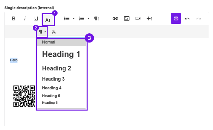 You can add headers, format your text, add paragraphs and bullet points and align as required, using the icons at the top of each section: