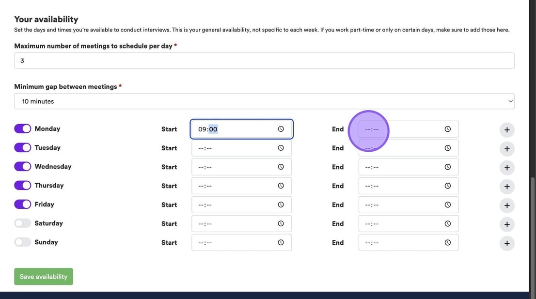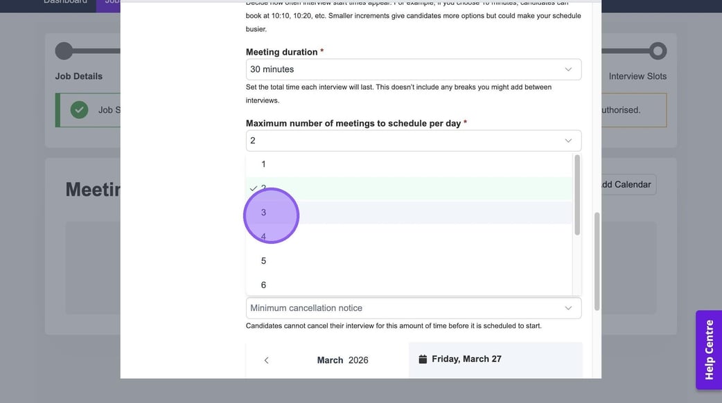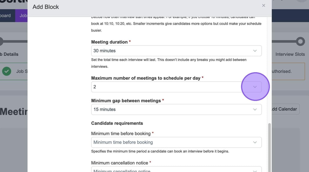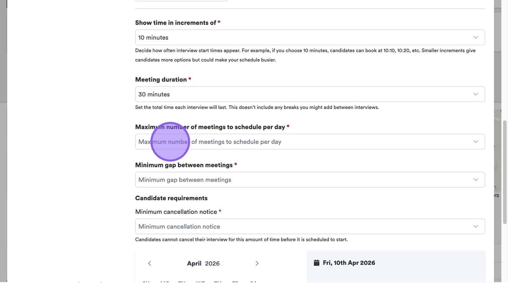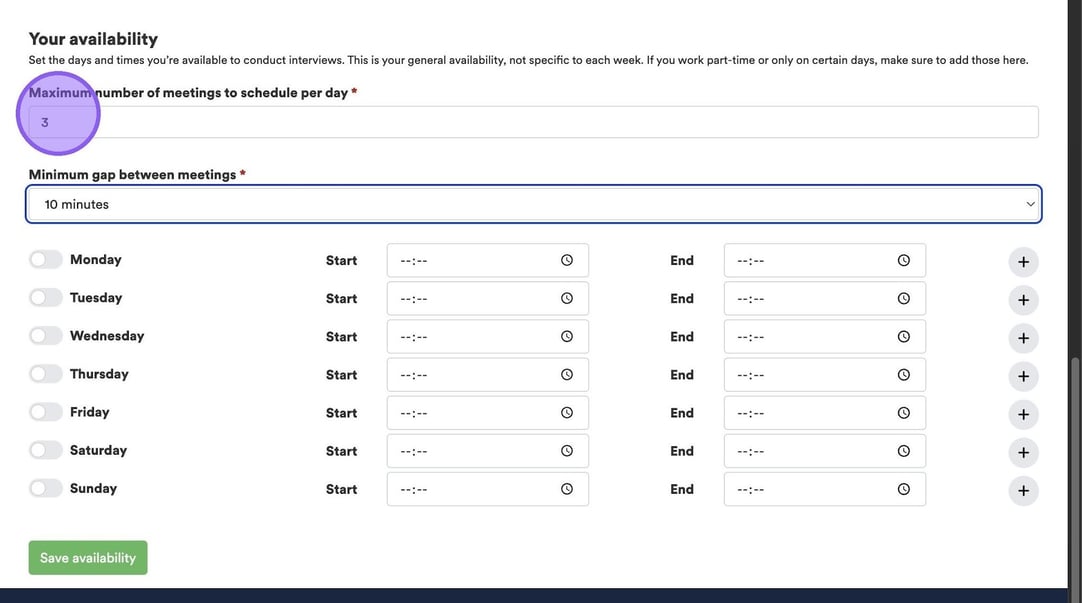Choose the maximum number of meetings you would like to schedule per day by clicking here. This may already be pre-populated if you have already set this in your ATS settings.