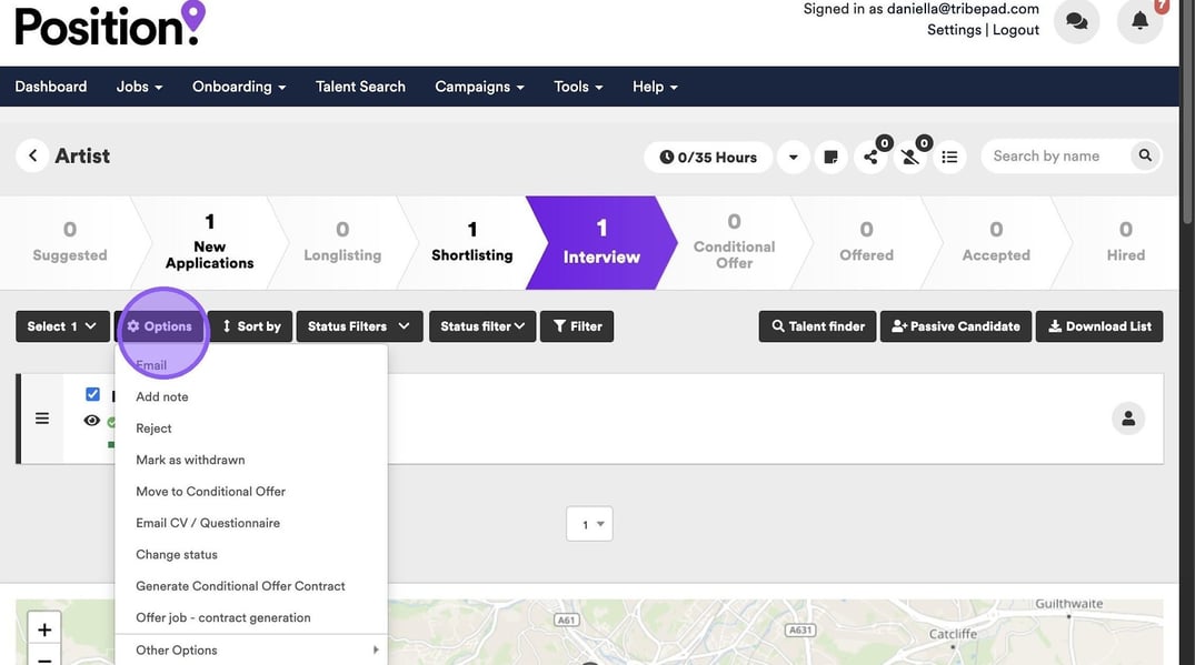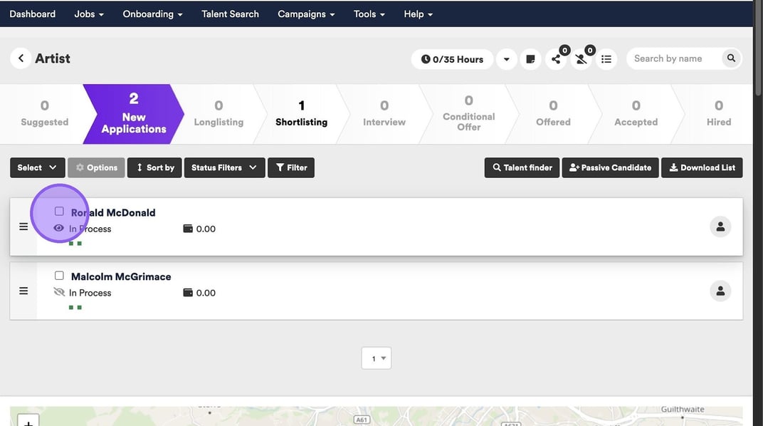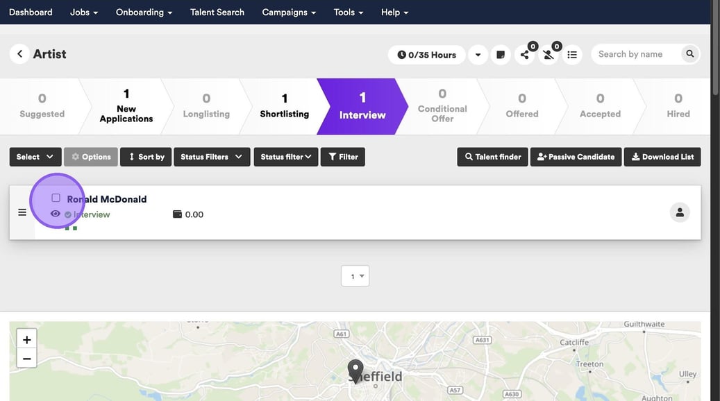 To arrange an interview in the ATS for a candidate, you should start by selecting the tick box next to their name whilst on a job.