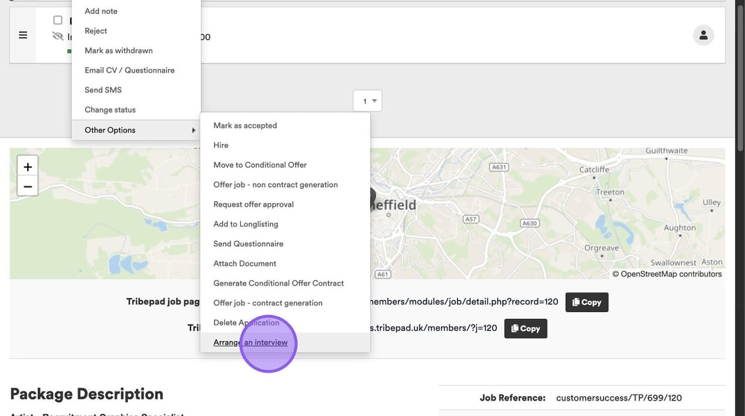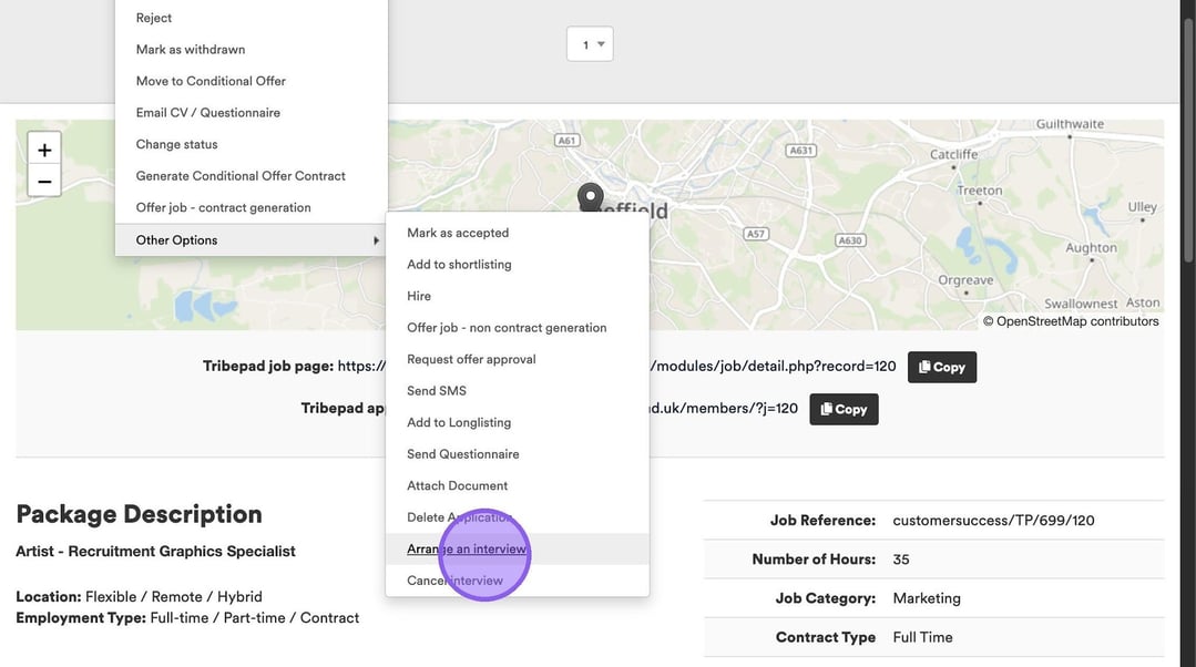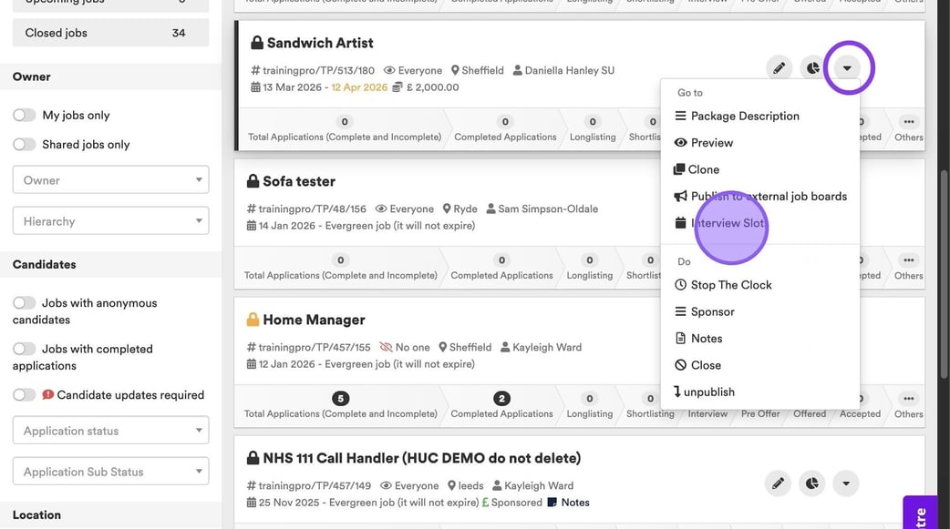 If you would like to pre-set up interview slots, to be used with the "Invite To Book" functionality, from the jobs list, on the relevant job, click the downwards facing triangle, followed by "Interview Slots".