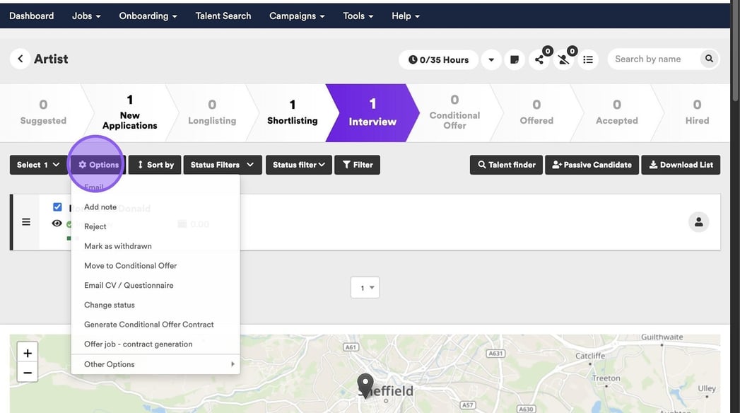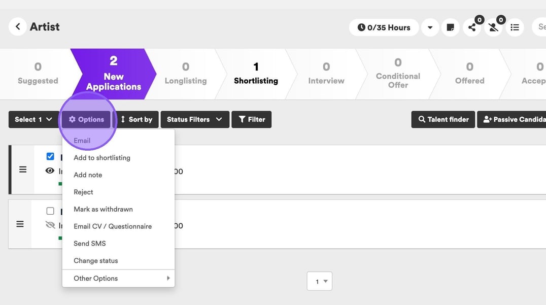 Lastly you are able to cancel an interview via the candidate options menu. Start by clicking the check box next to their name.