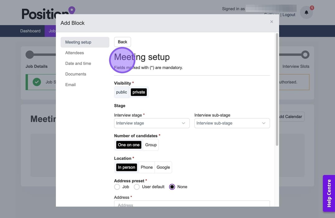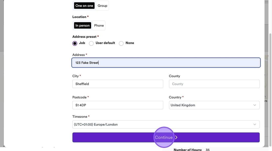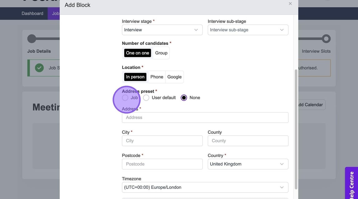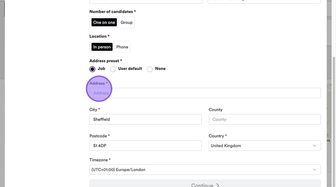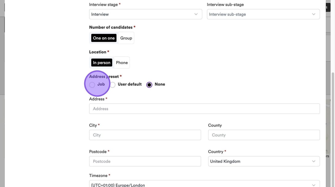 Once you have set the above or if you chose one on one interview you will now need to set the address for your interview. You have the option to either set the address on the job, your user default or none - regardless of which you choose you are still able to amend any fields whether they have been pre-filled or not.