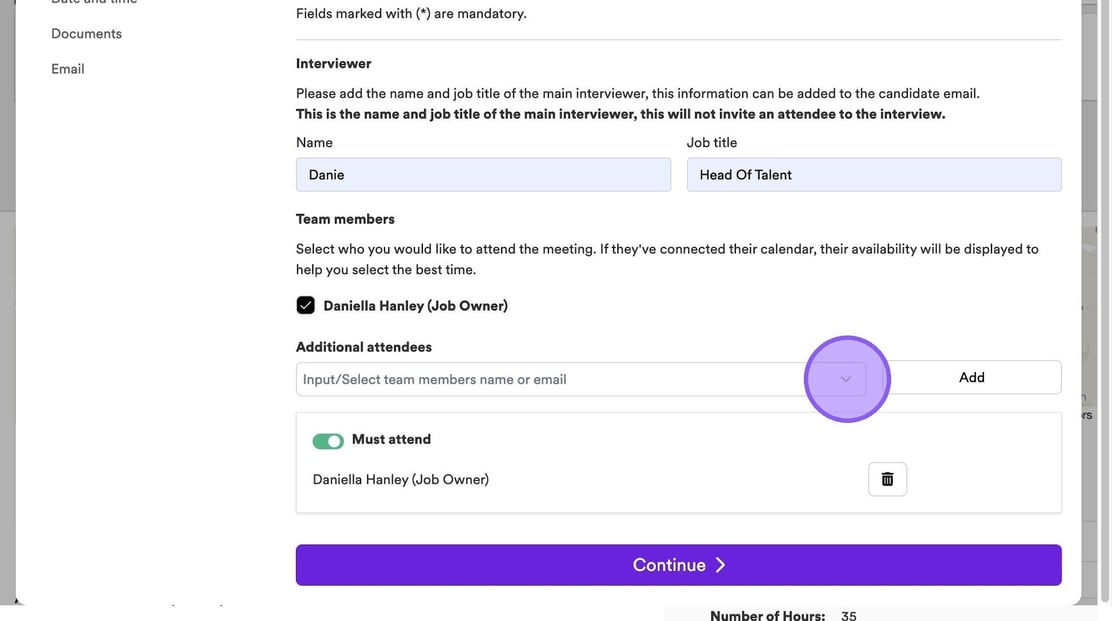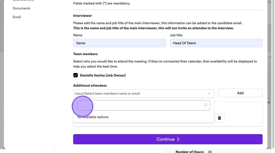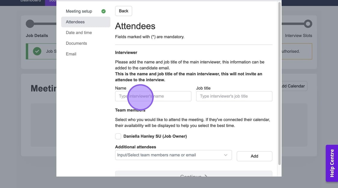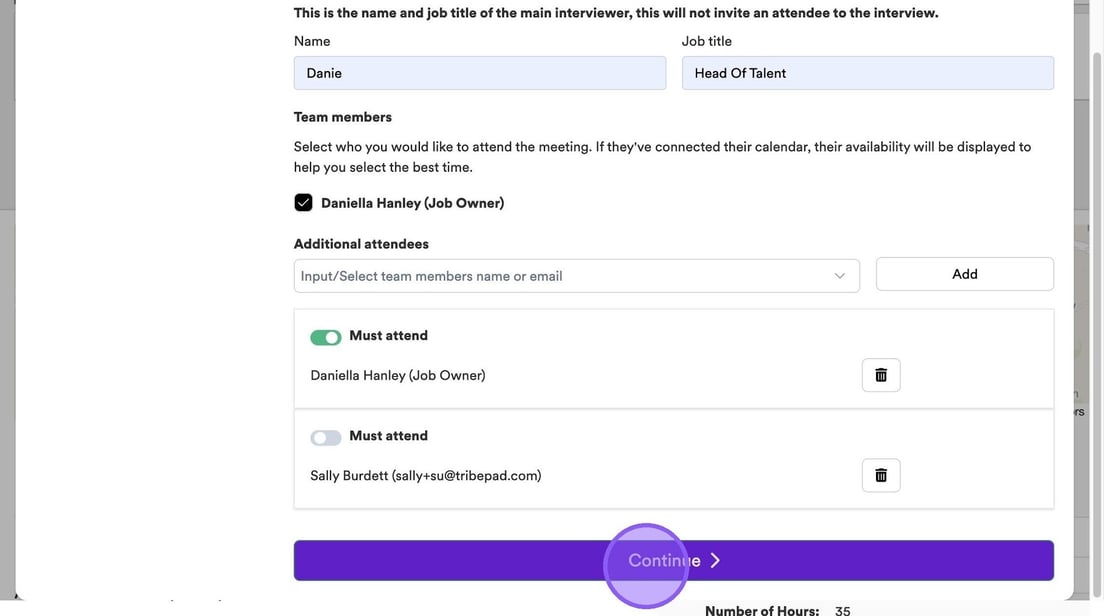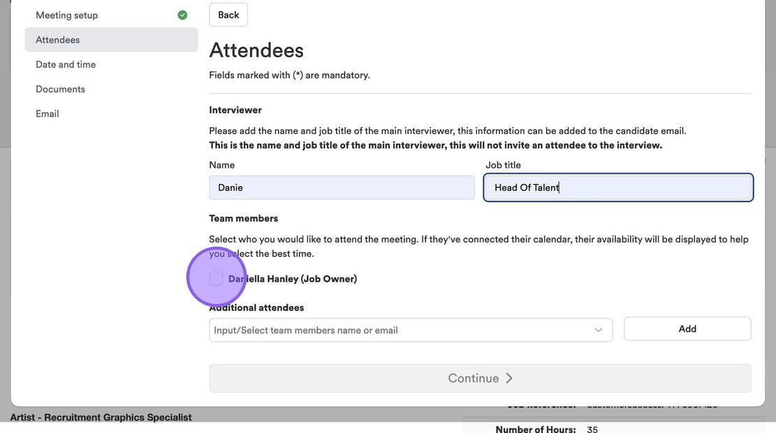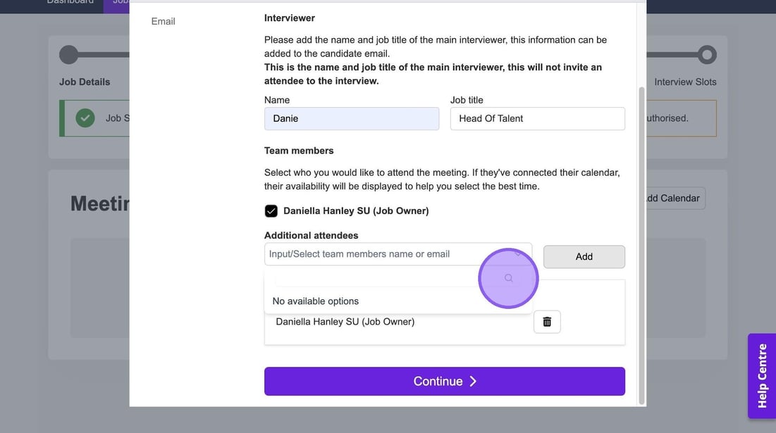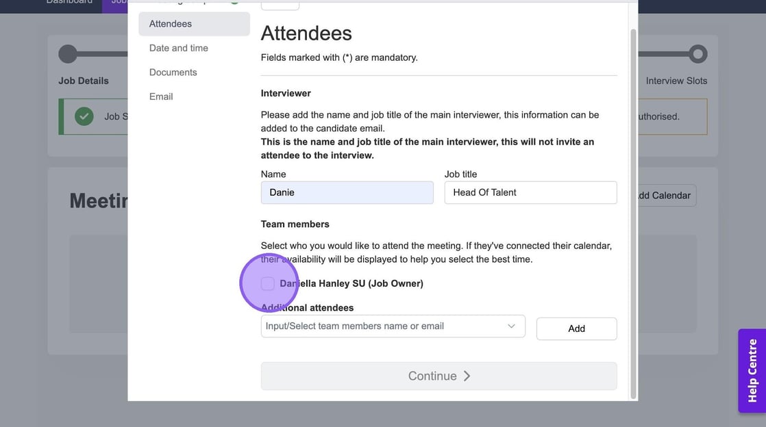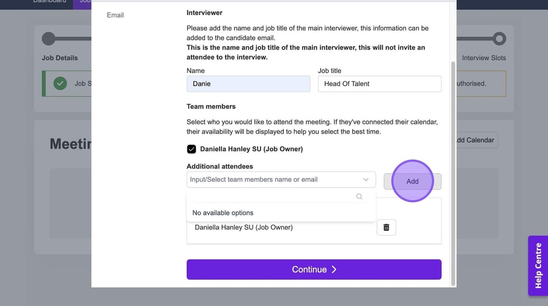 It's now time to add in any additional team members who will be attending your interview. If other colleagues have connected their calendar, you will see them here and be able to select a check box next to their names.