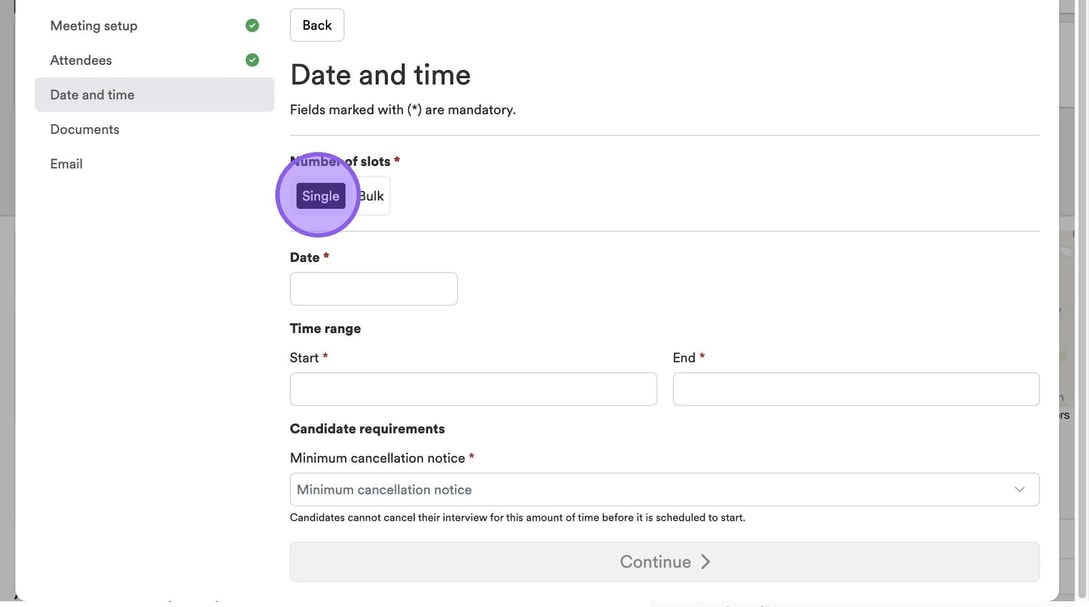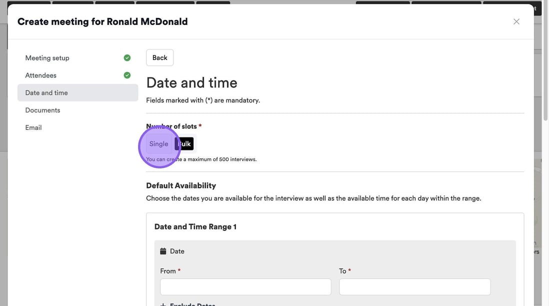 Next, choose if your interview is for a single candidate, i.e. a one-on-one (or panel-style) interview, or if it is for a group, e.g. an assessment centre.