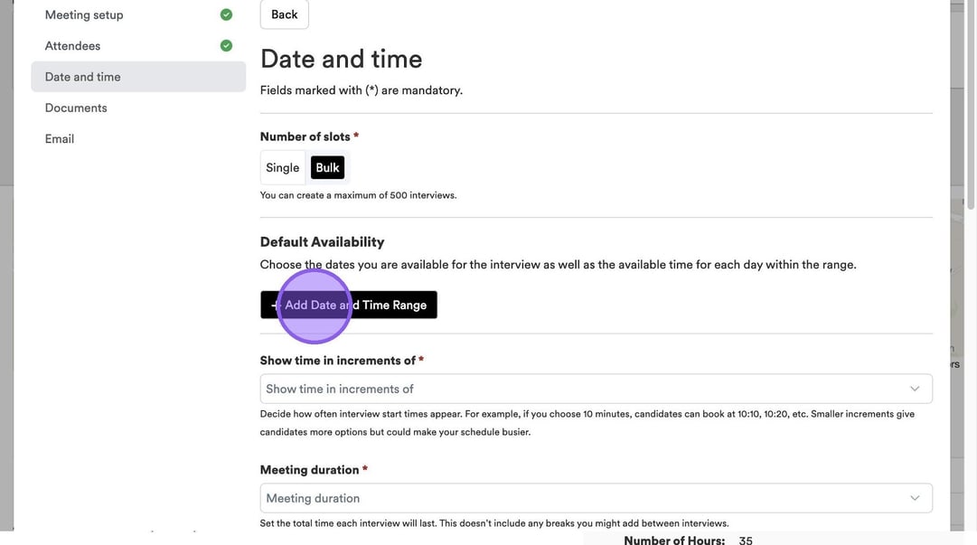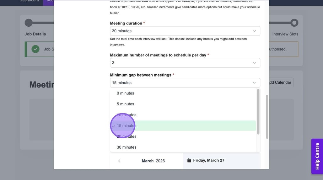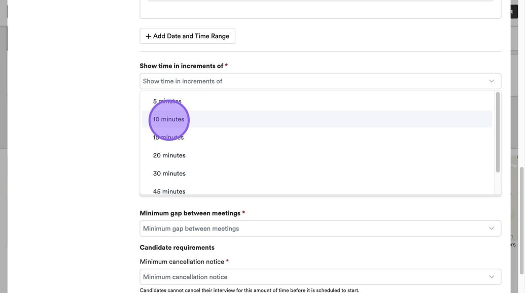 You will see a list of options to select from. For example, when choosing how often your start times will appear, be aware that a 10-minute interval allows bookings at 10:10, 10:20, and so on. Be aware that shorter intervals offer more flexibility for candidates but may result in a busier schedule for you.