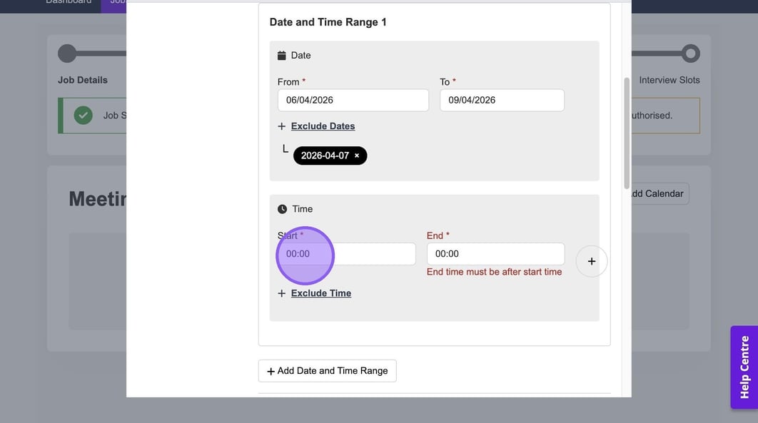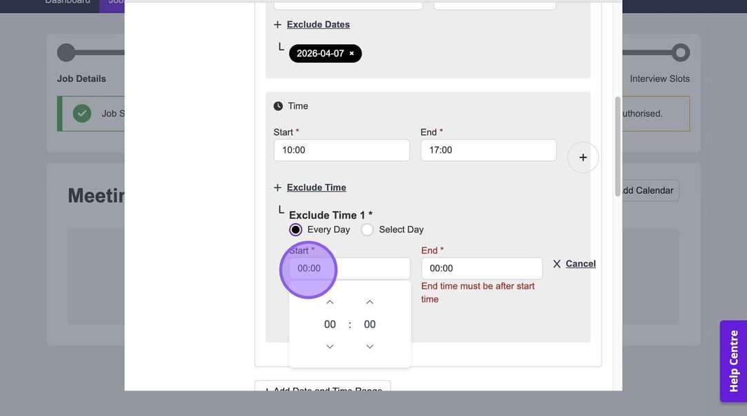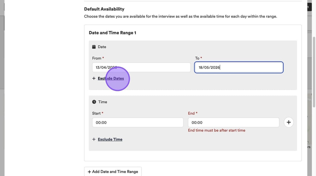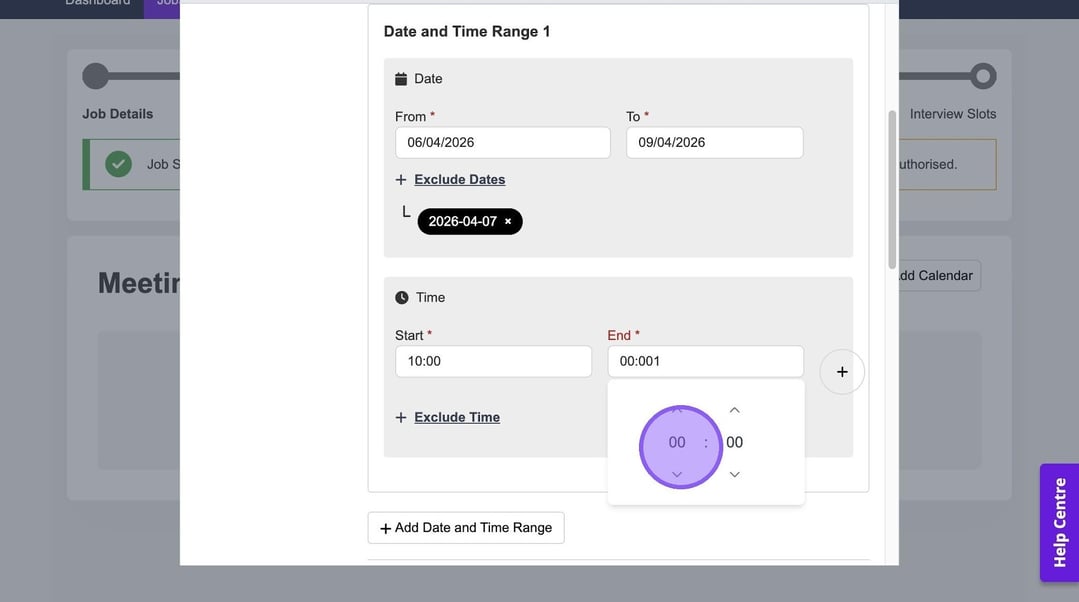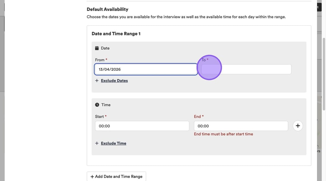 Now you will need to set your available times to interview by clicking this field. To select a time, you have the option to either type this, or to click on the arrows above & below the numbers.