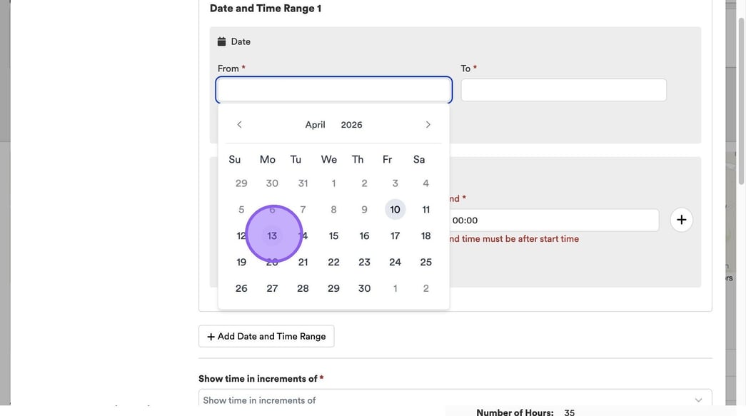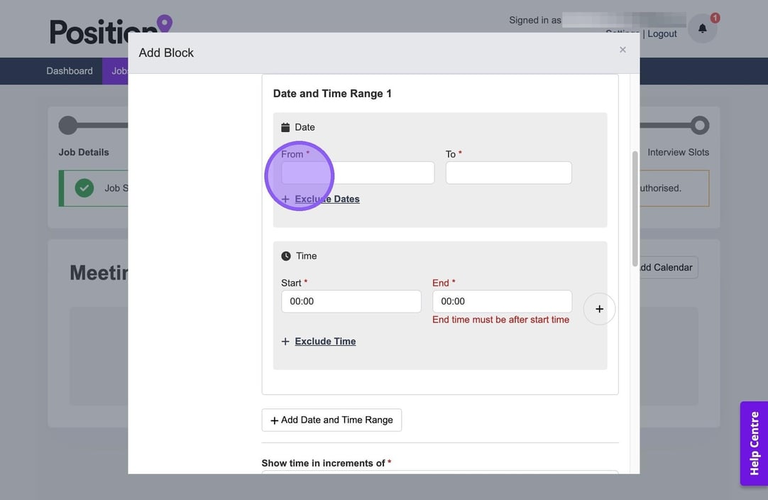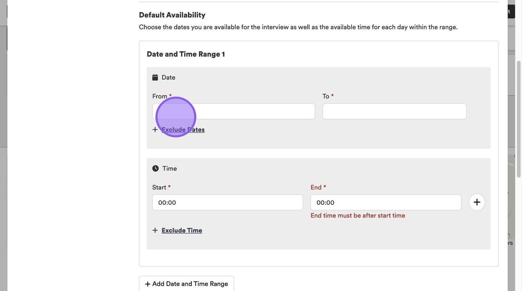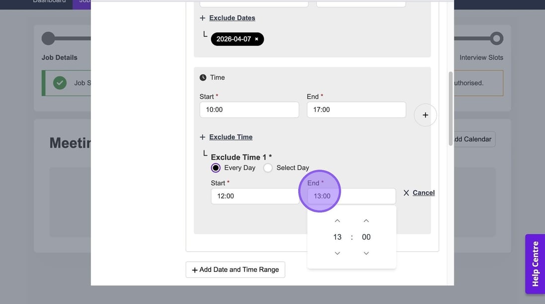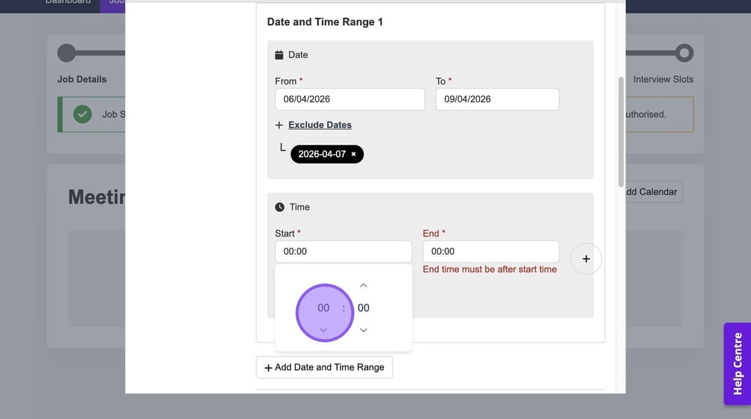 Now you will need to set your available times to interview by clicking this field. To select a time, you have the option to either type this, or to click on the arrows above & below the numbers.