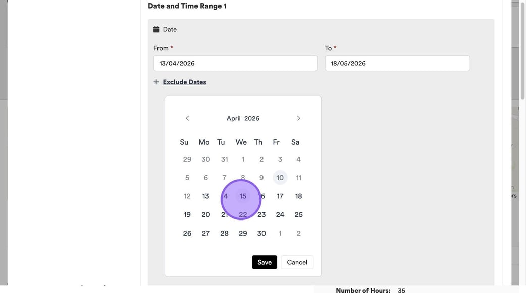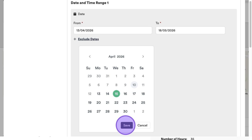 If you would like to exclude any specific dates from your "from" and "to" block of time, click the "Exclude Dates" text here.