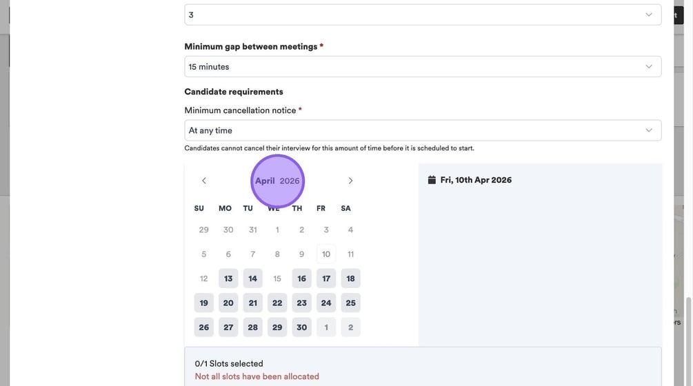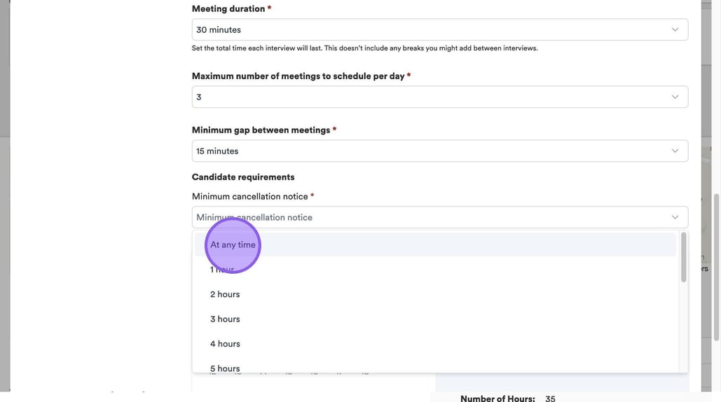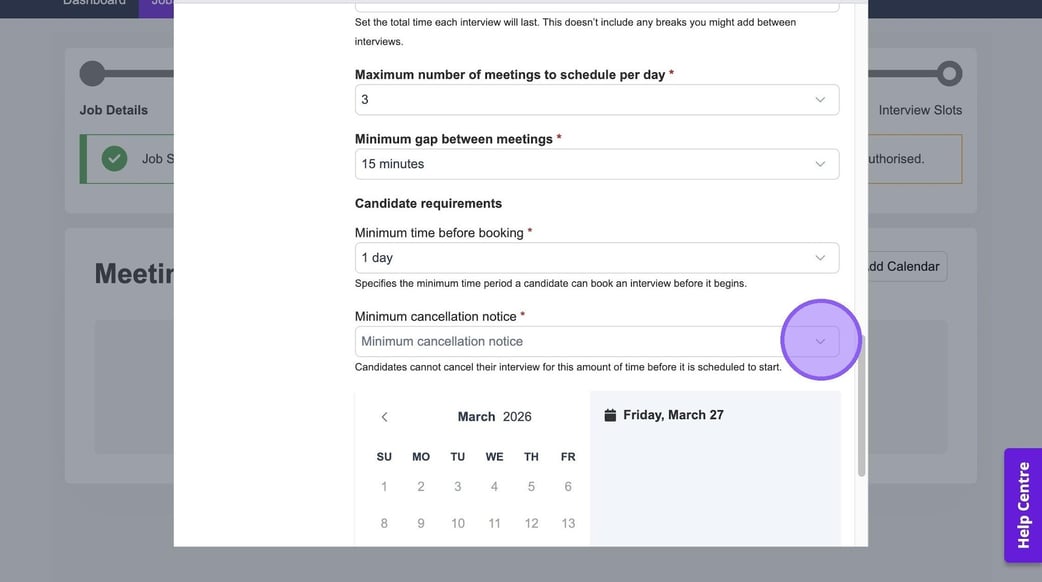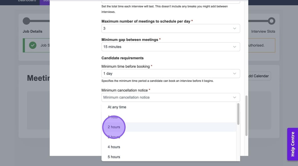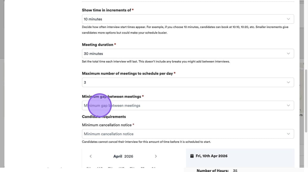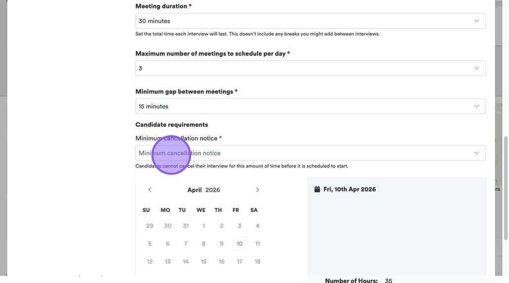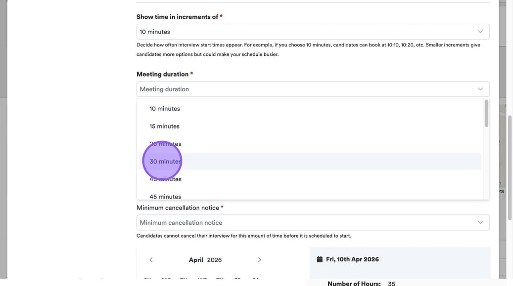 Click "Minimum cancellation notice" to set a period of time that a candidate can cancel their interview before it is due to start.