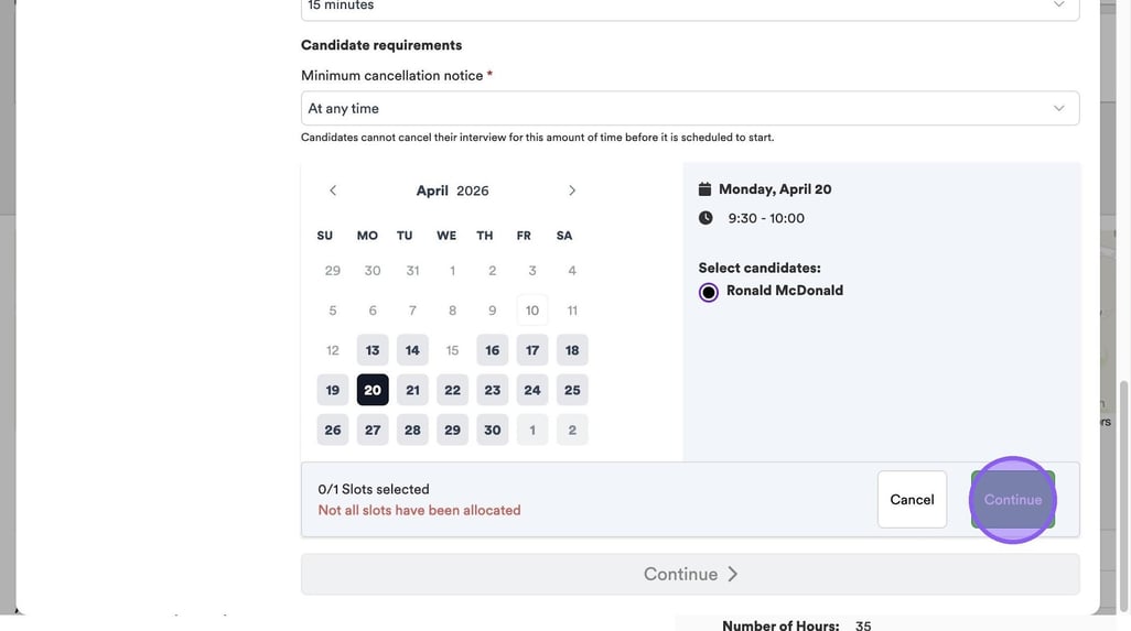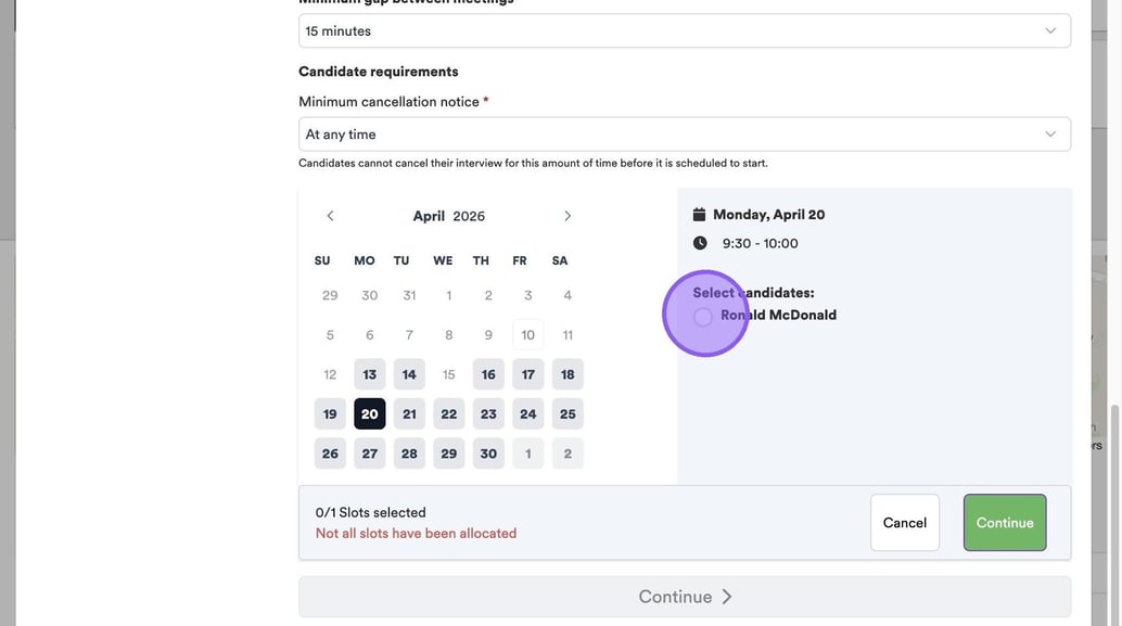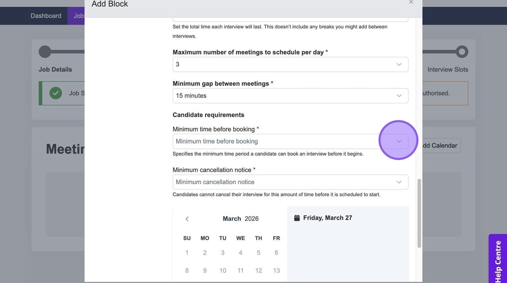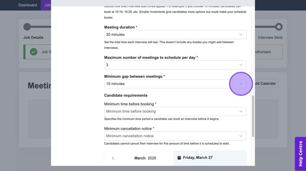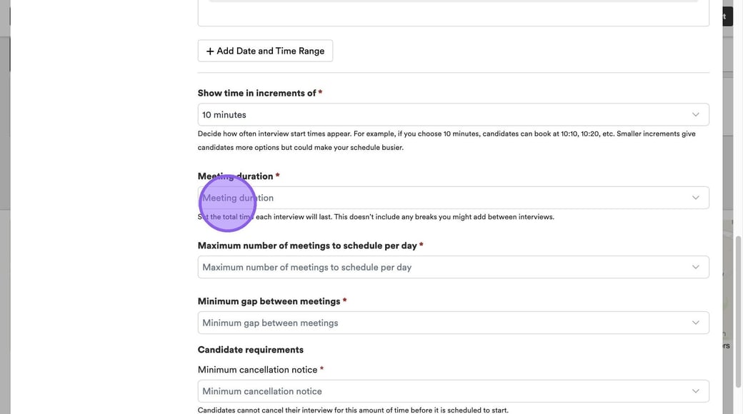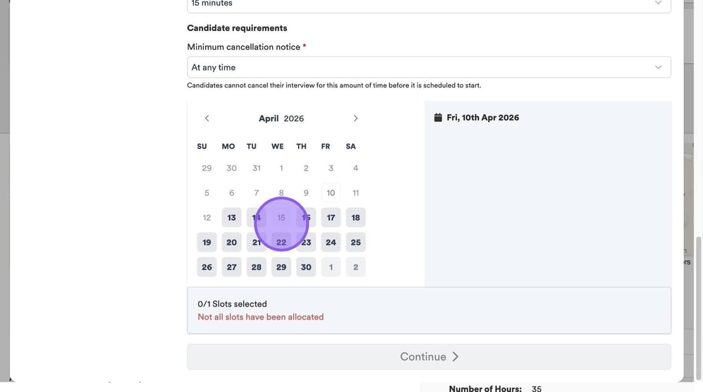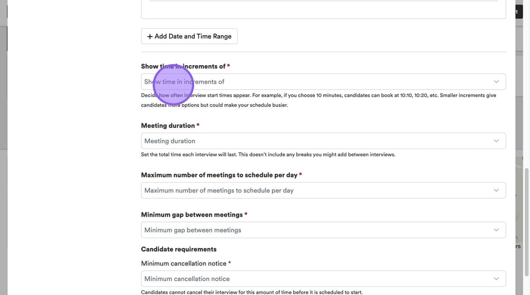 Click "Minimum cancellation notice" to set a period of time that a candidate can cancel their interview before it is due to start.