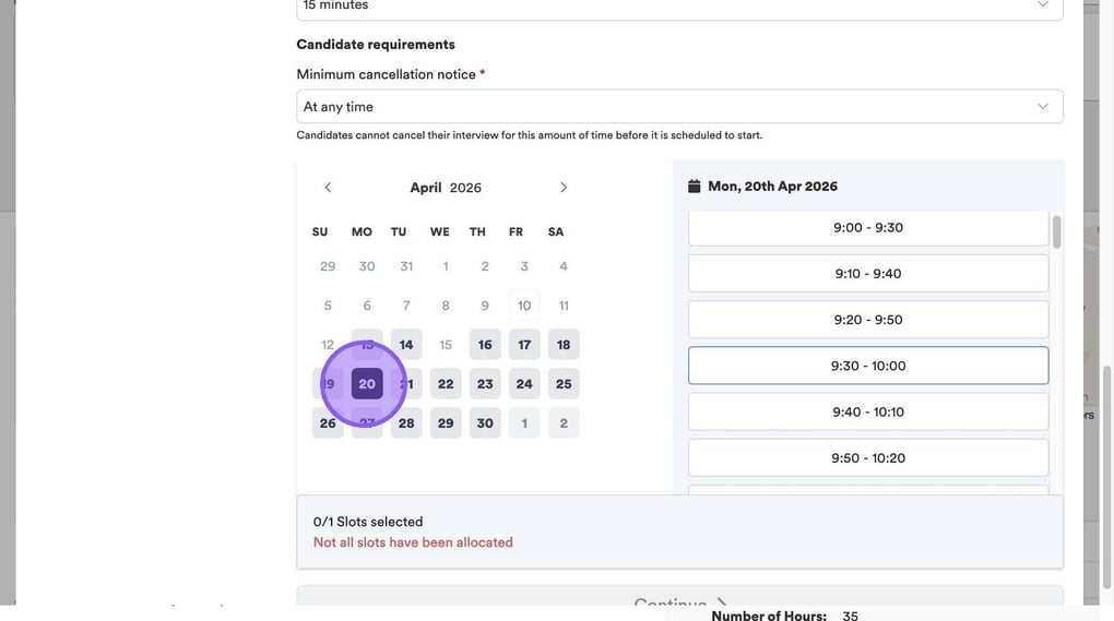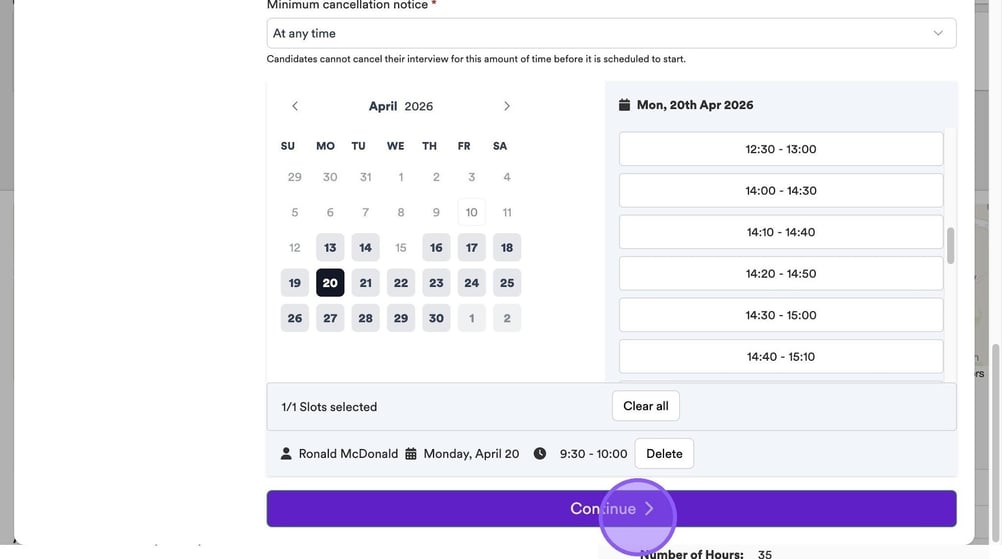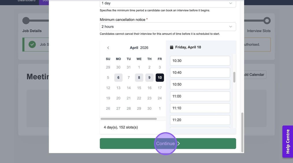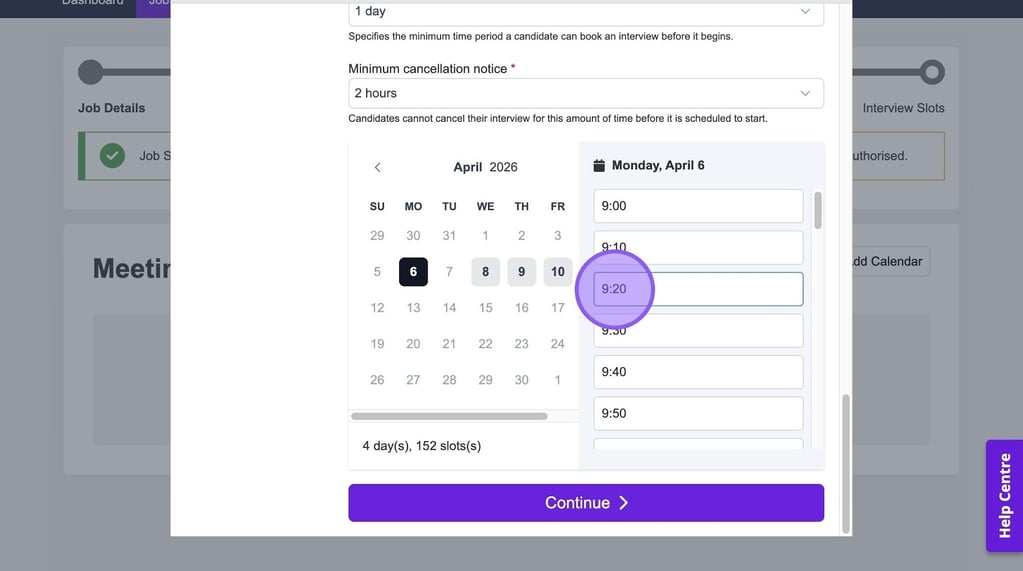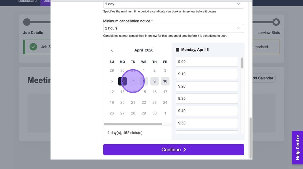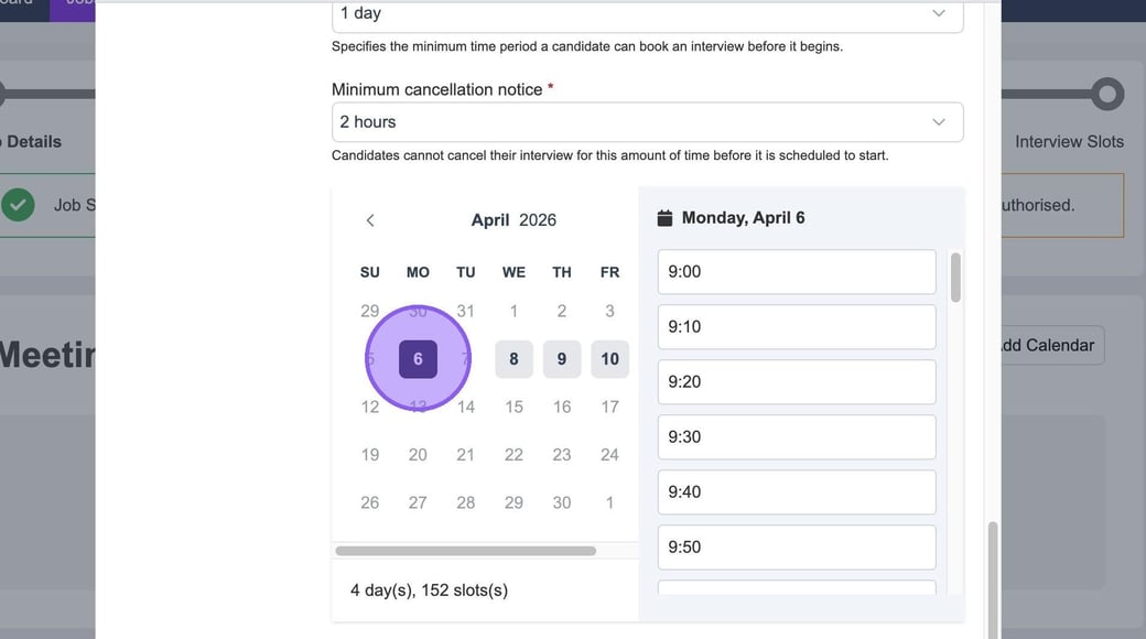 Based on the information you have entered in the previous steps, your linked calendar and any availability settings, you will now see available dates & times for you to book your interviews.