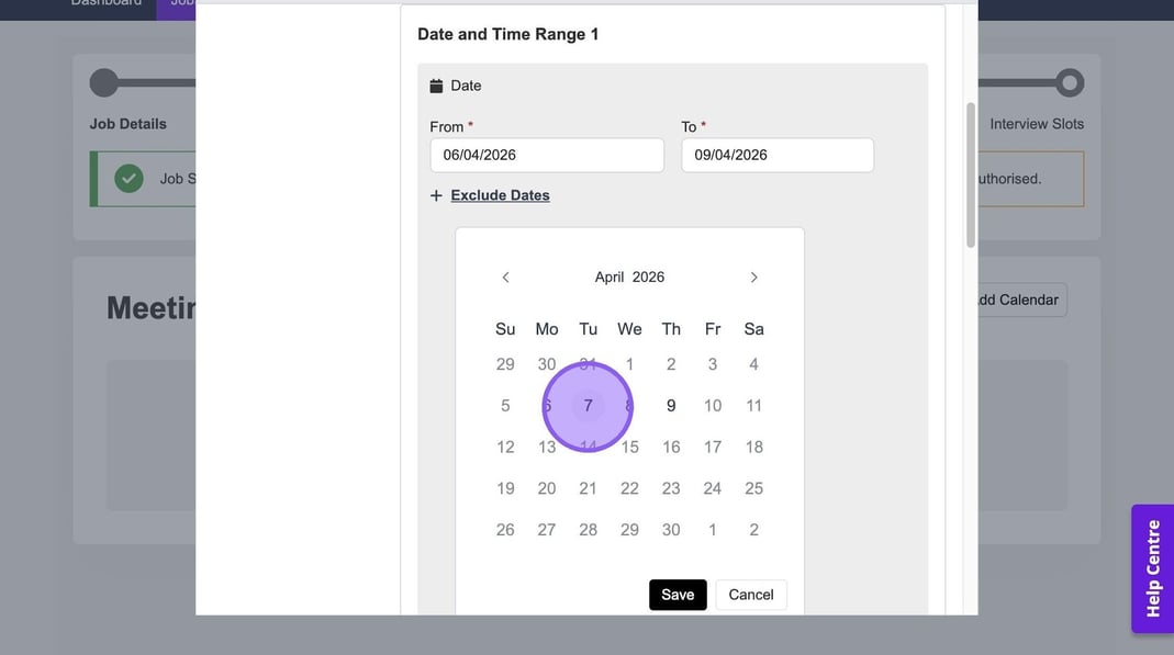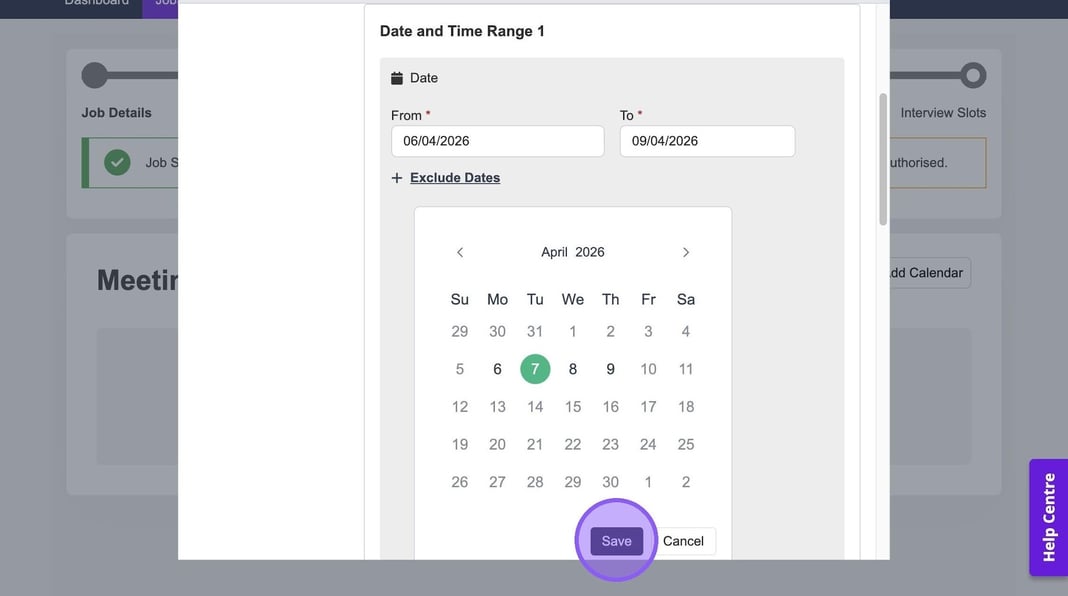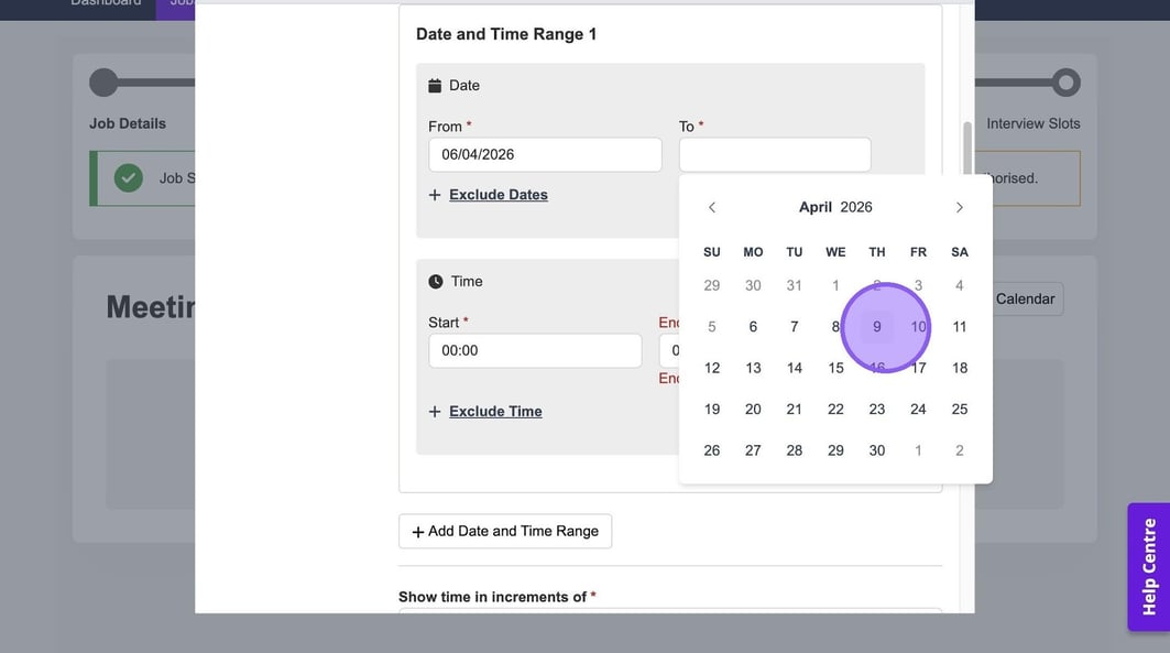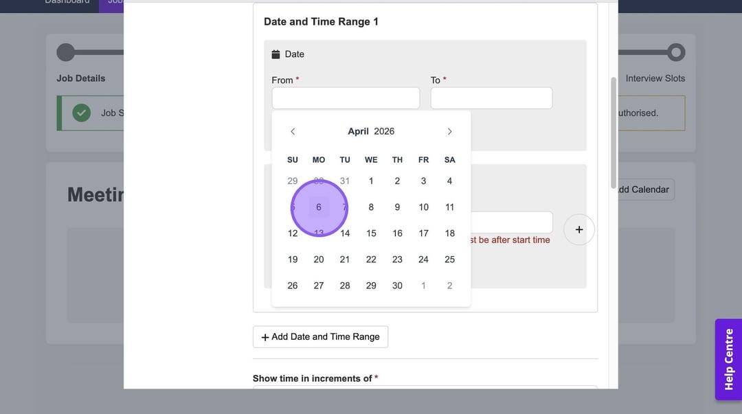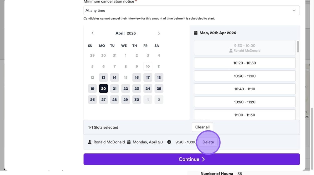 Based on the information you have entered in the previous steps, your linked calendar and any availability settings, you will now see available dates & times for you to book your interviews.