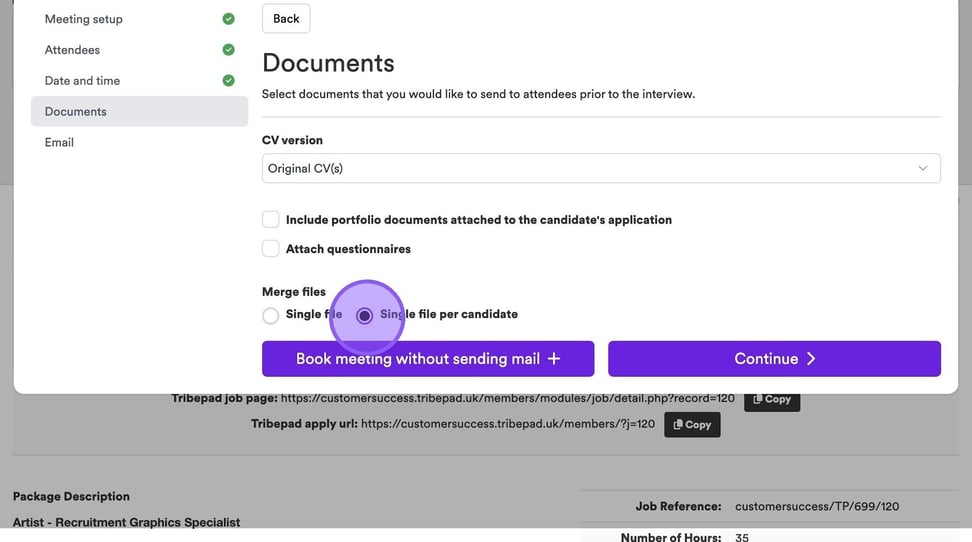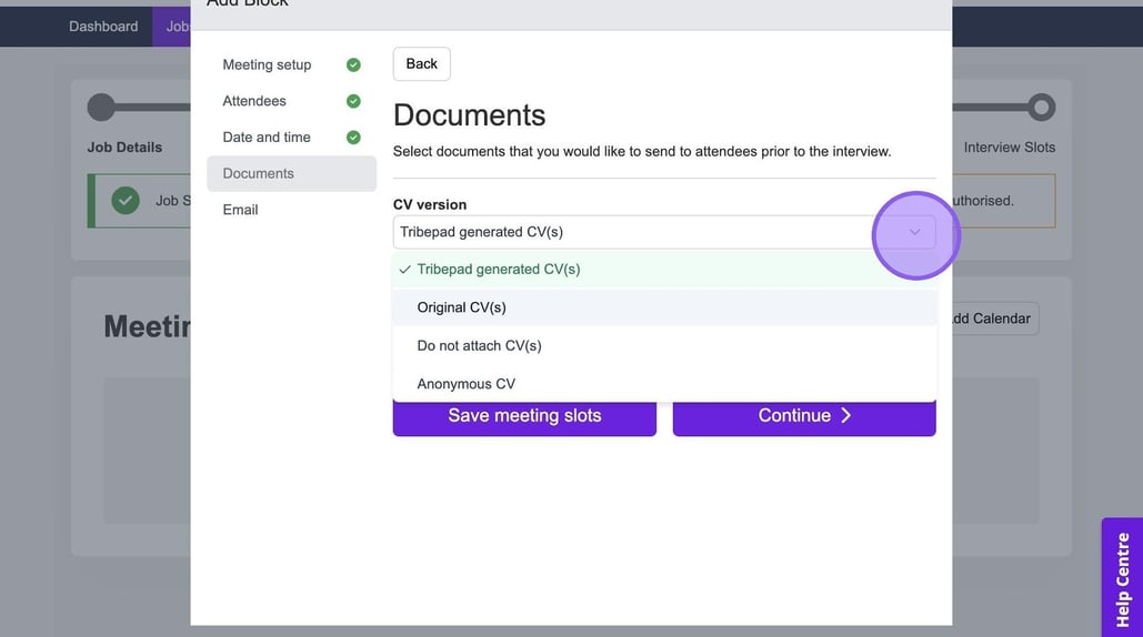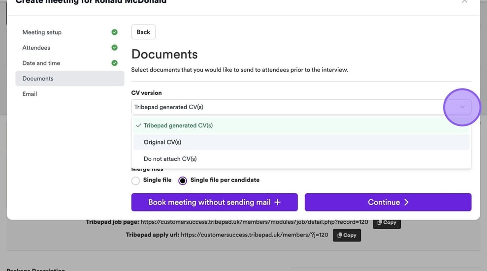 If you would like to send a candidate's CV to attendees prior to an interview, click the drop-down menu here and select the relevant option from the list.