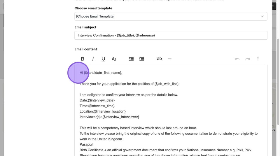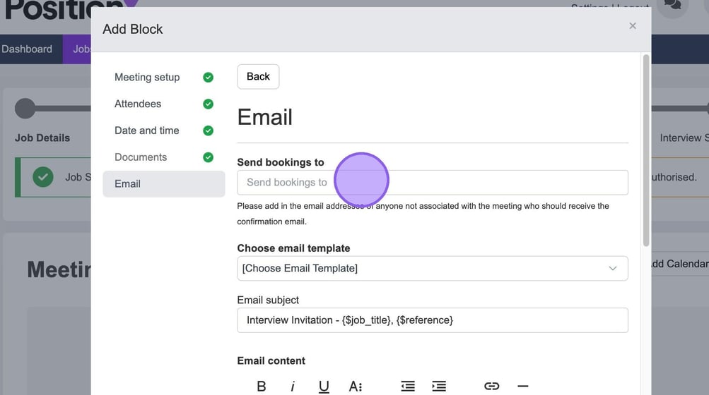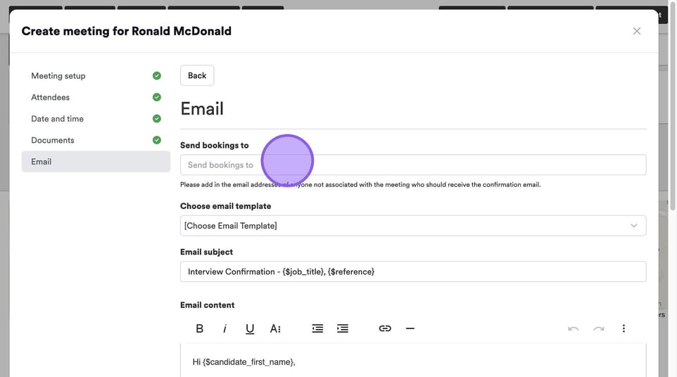 You will now be taken to the final stage of the process, where you are able to set-up any emails that will be sent to the candidate. To get started add any email addresses of any colleagues you have that will not be attending the interview, but need visibility on who you are inviting here.