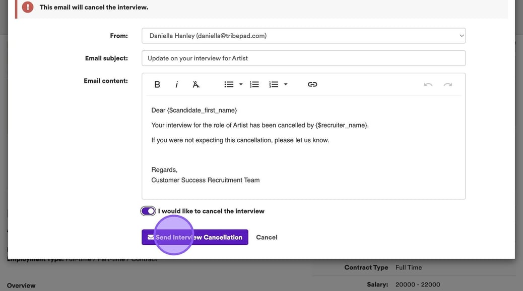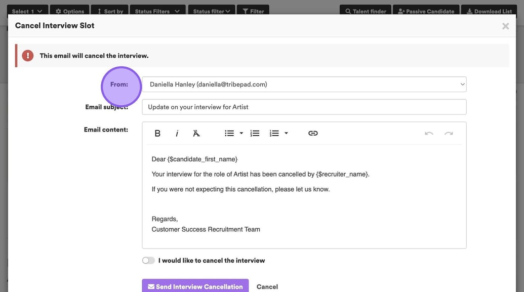 Clicking ‘Cancel Interview’ via any of the three options, will refresh your screen and you will see the following pop-up with an email template that will be sent to the candidate.