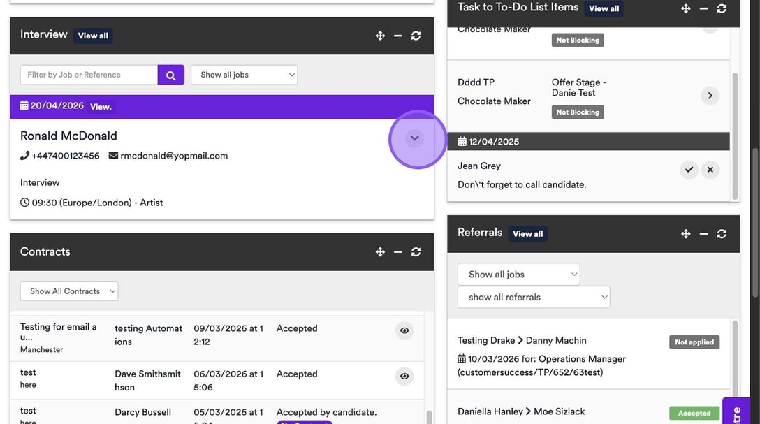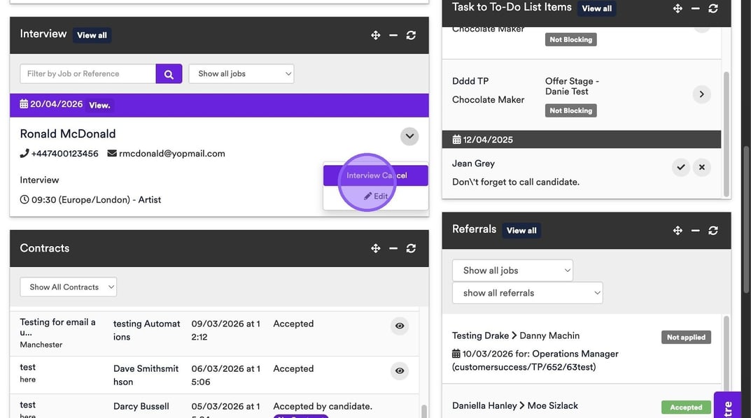 If you wish to cancel a Meeting or interview in the ATS, you are able to do this from 3 places. The first being via the main Dashboard and Interview widget. To start click on the following icon.