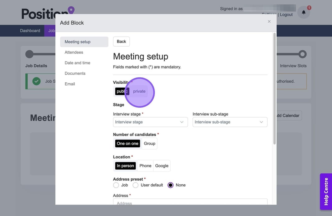 If you choose ‘Public’, anyone viewing your calendar will be able to see details of the interview, e.g. ‘John Smith, Tuesday 10am November 26th, Recruitment Administrator role.’ If you choose ‘Private’, the interview will just show you as ‘Busy’ in your calendar.