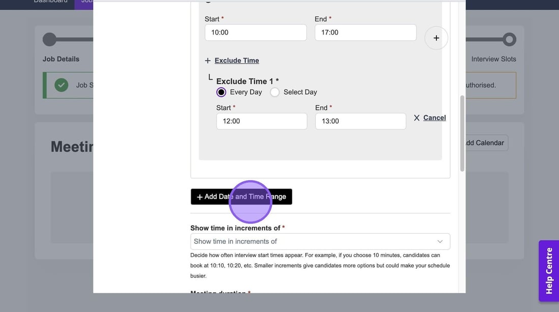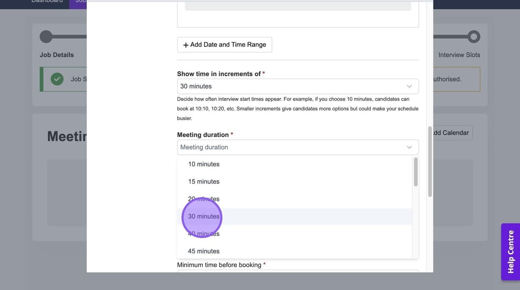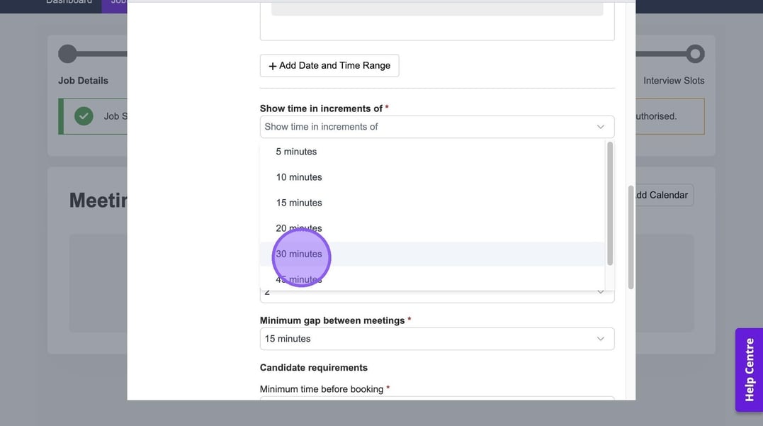 You will see a list of options to select from. For example, when choosing how often your start times will appear, be aware that a 10-minute interval allows bookings at 10:10, 10:20, and so on. Be aware that, shorter intervals offer more flexibility for candidates but may result in a busier schedule for you.