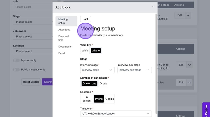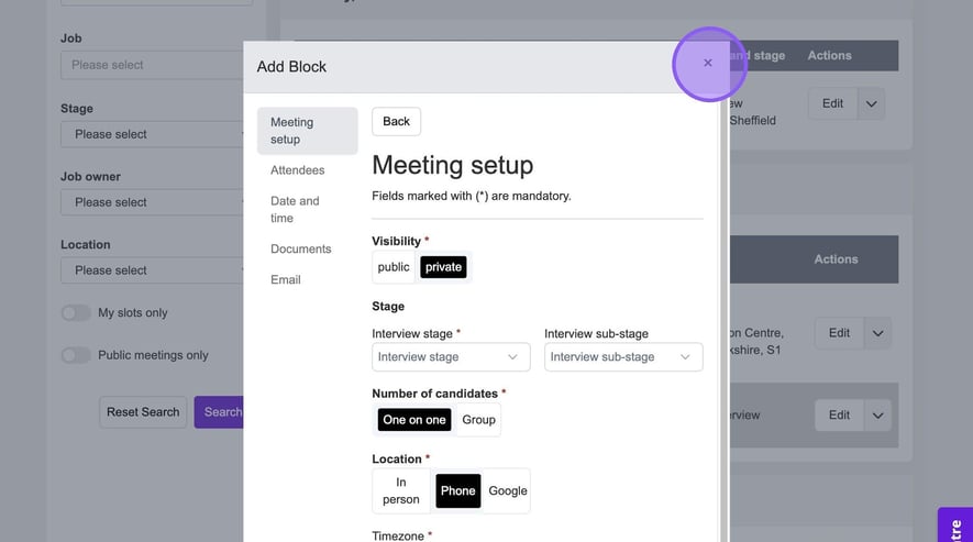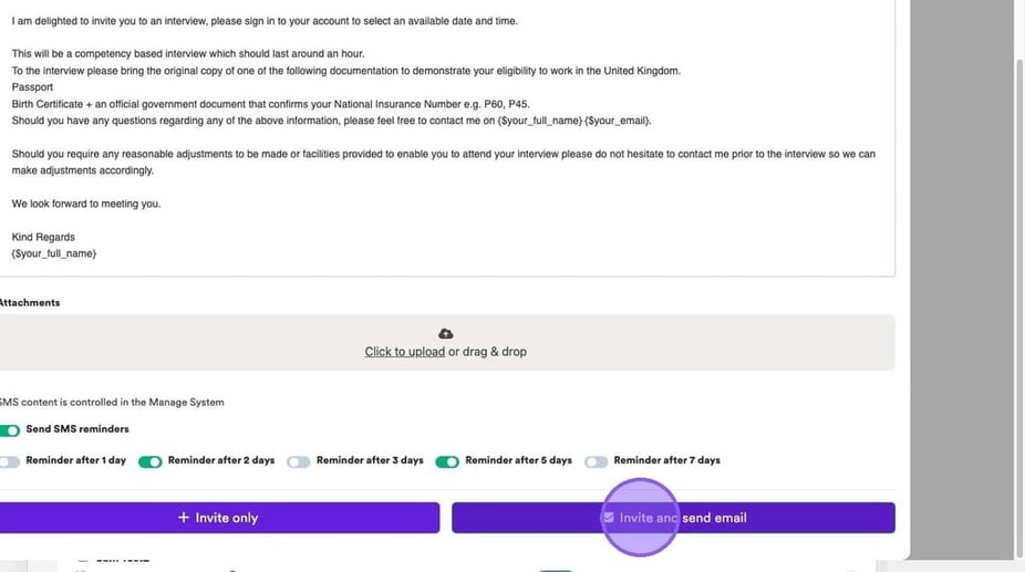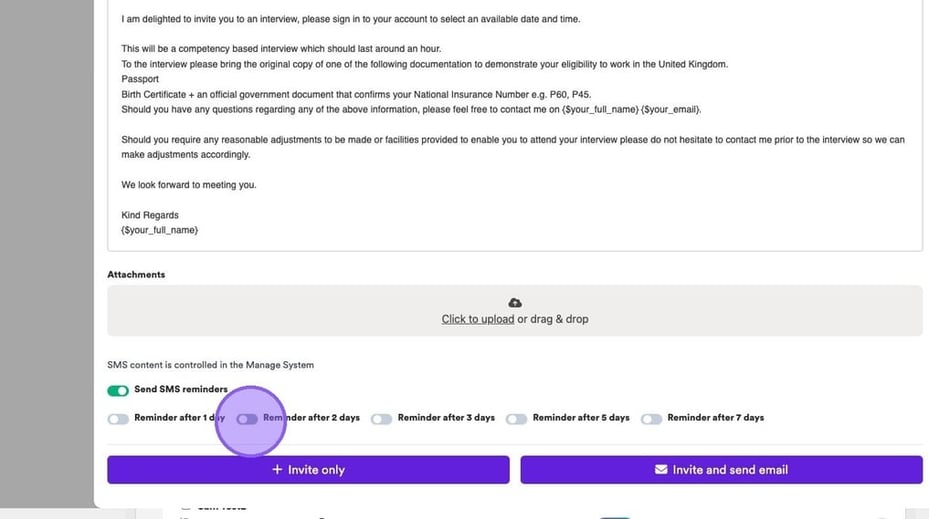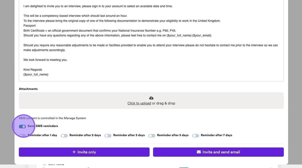 If you would like to enable SMS reminders to remind candidates to book their slot, at the bottom of the following pop-up click the "Send SMS reminders" field.