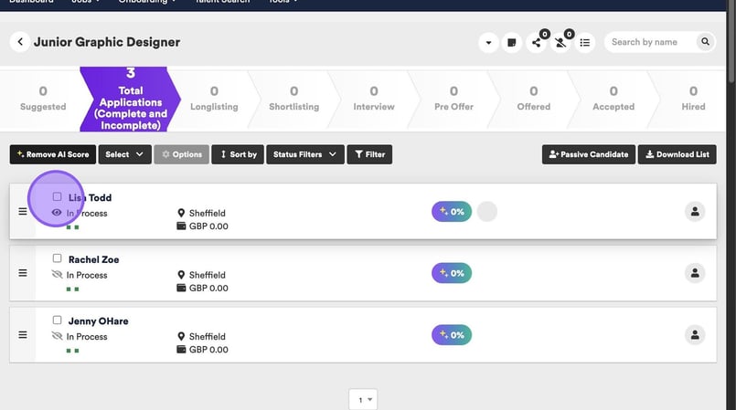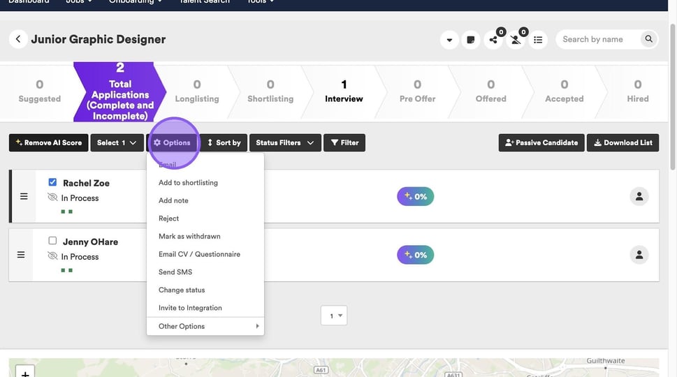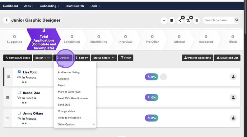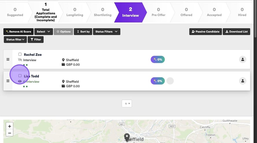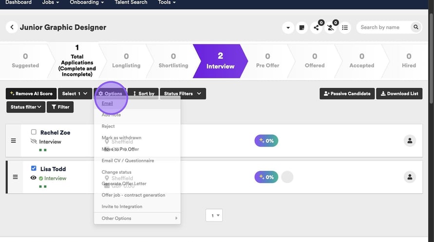 Lastly you are able to cancel an interview via the candidate options menu. Start by clicking the check box next to their name.