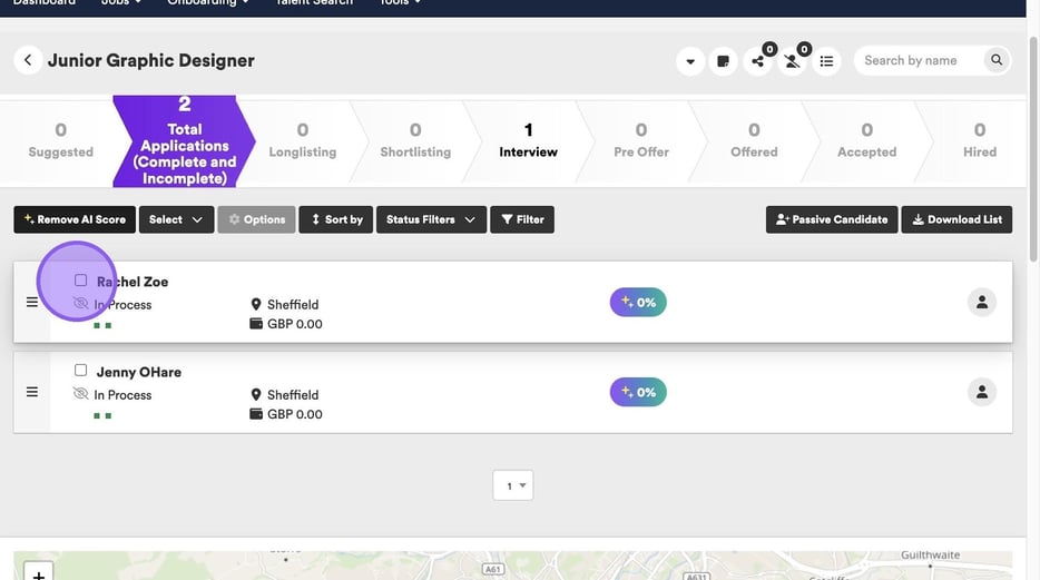 To arrange an interview in the ATS for a candidate, you should start by selecting the tick box next to their name.
