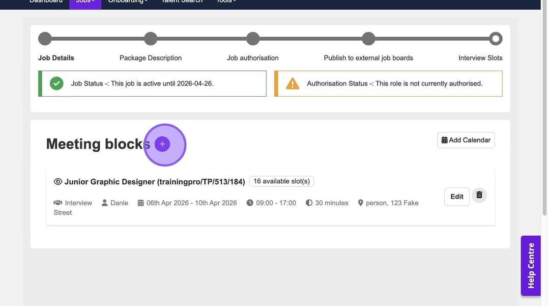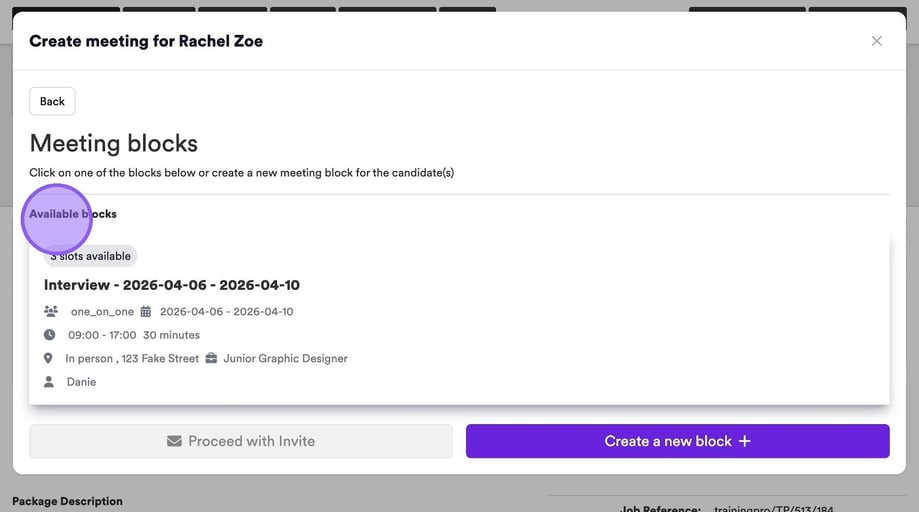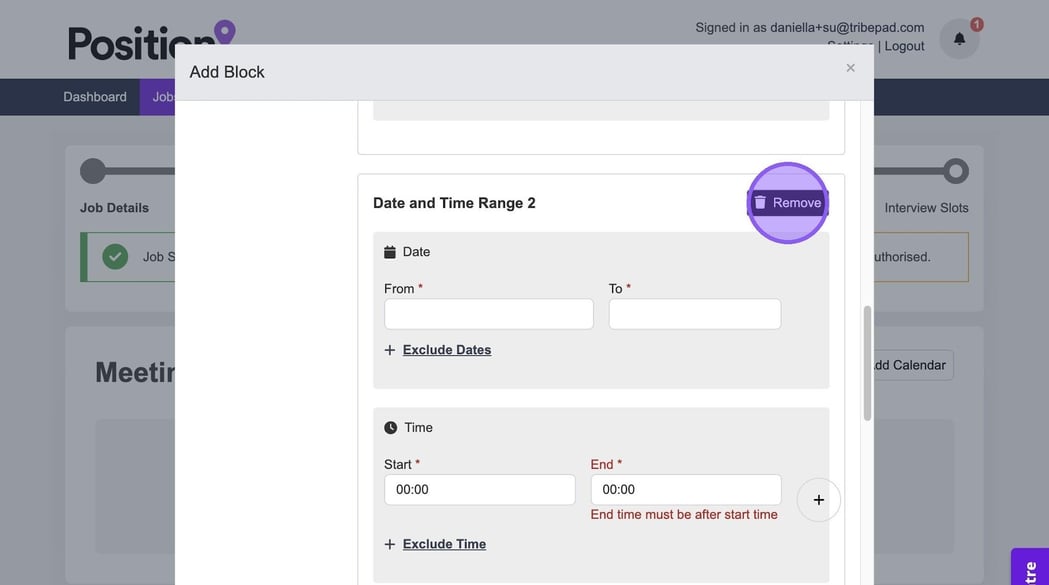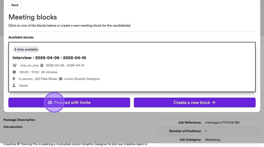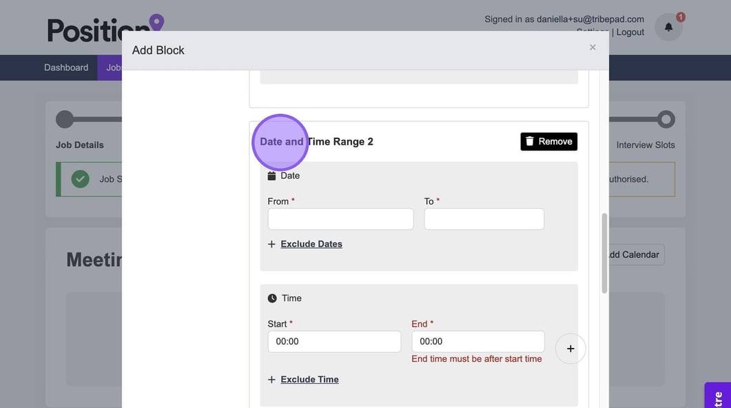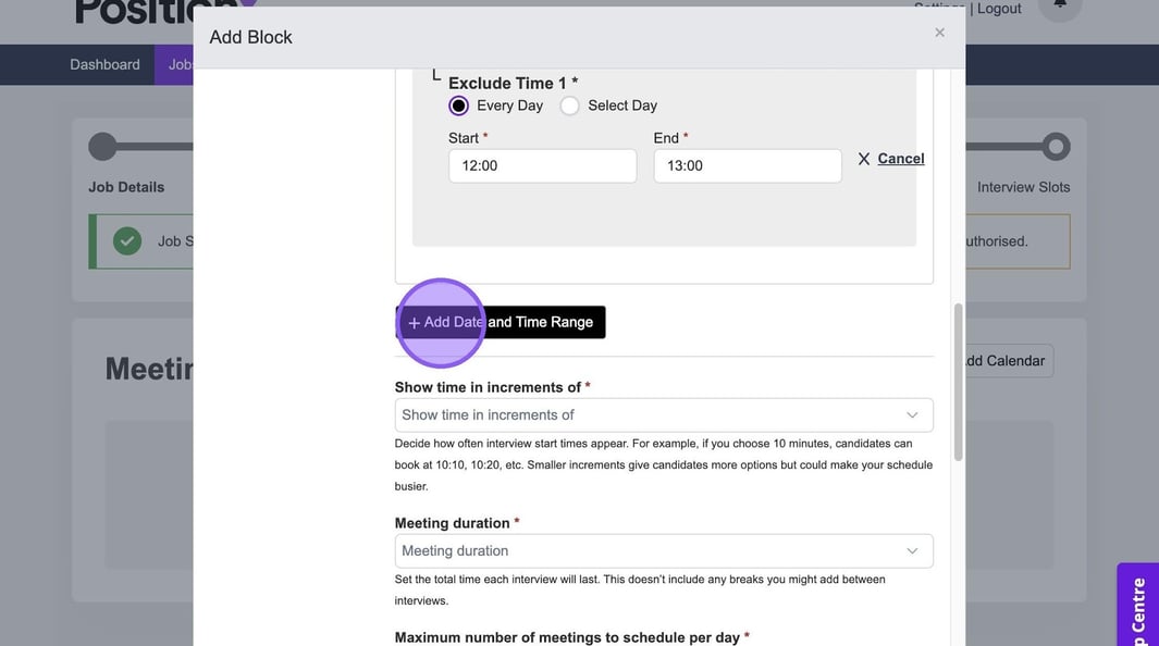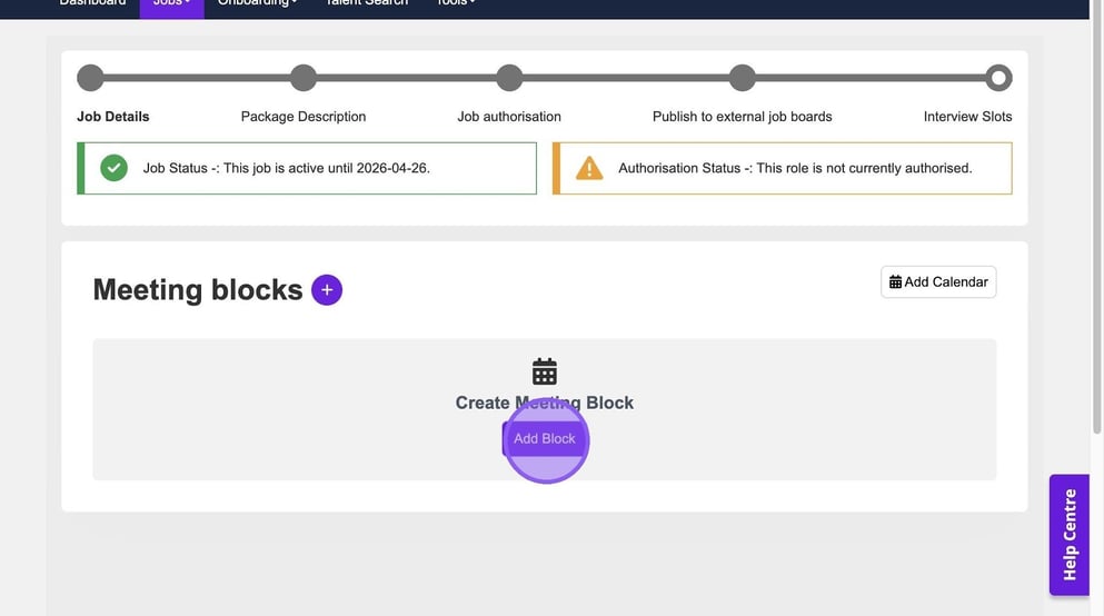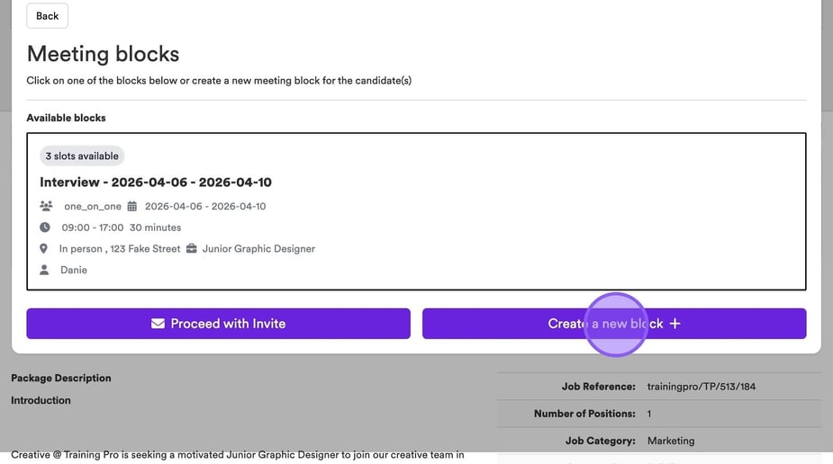 There is also the ability to create another block if needed, using the purple plus icon. If you do not need to make any further changes you have completed the process and set up your interview slots.