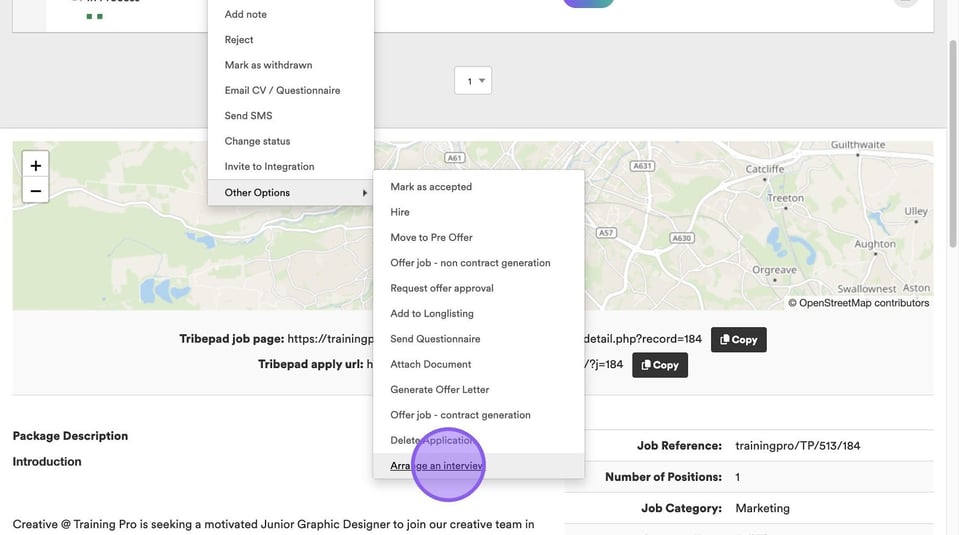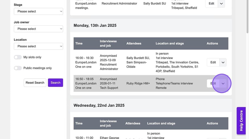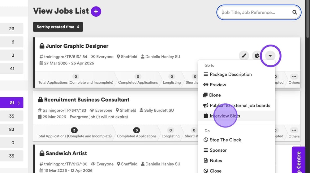 If you would like to pre-set up interview slots, to be used with the "Invite To Book"🖱️ functionality, from the jobs list, on the relevant job, click the downwards facing triangle, followed by "Interview Slots".