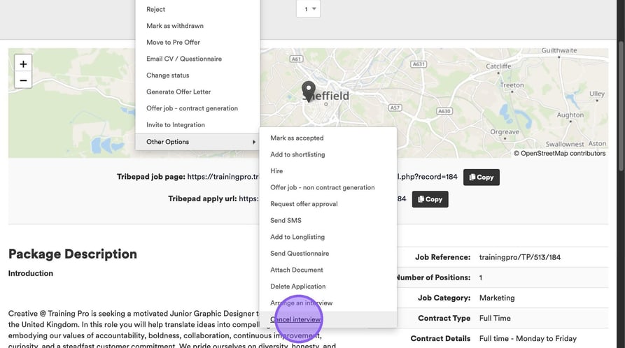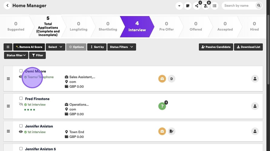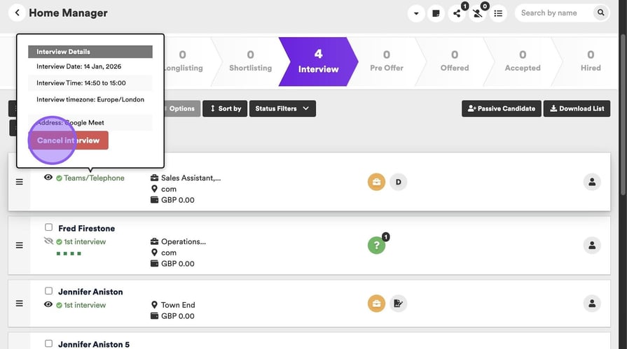 You can also cancel an interview from within a job. To do this, hover over the interview details under the candidates name.