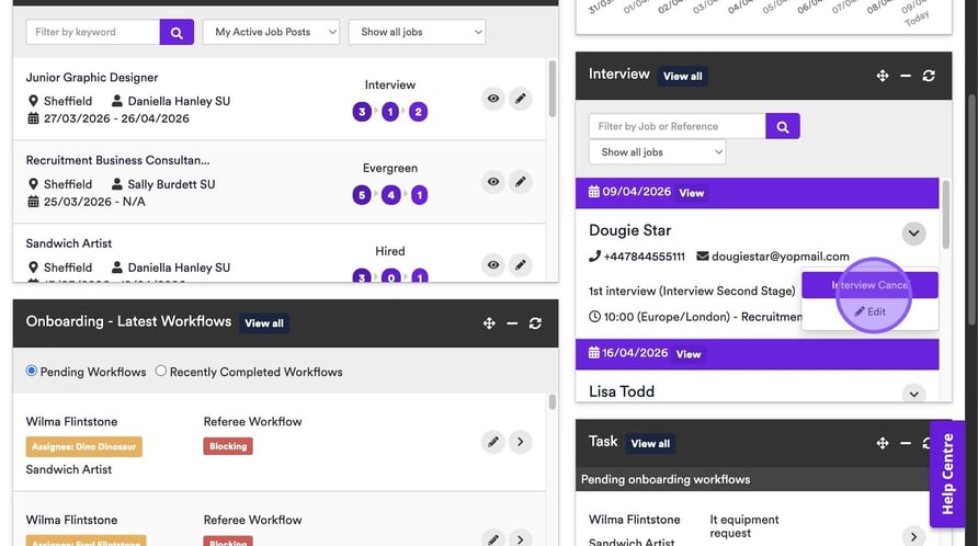 If you wish to cancel a Meeting or interview in the ATS, you are able to do this from 3 places. The first being via the main Dashboard and Interview widget. To start click on the following icon.