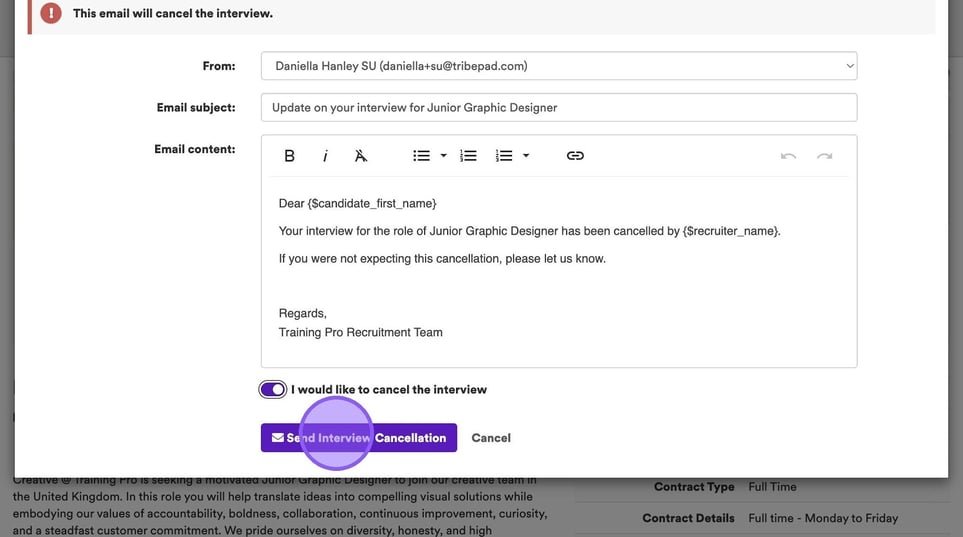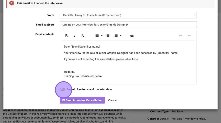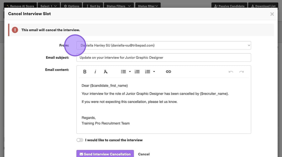 Clicking ‘Cancel Interview’ via any of the three options, will refresh your screen and you will see the following pop-up with an email template that will be sent to the candidate.