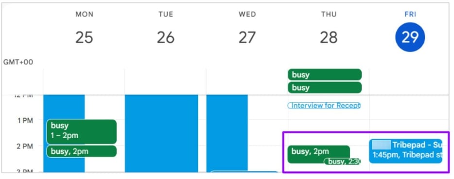 Depending on your organisation’s calendar settings (for example, company-wide events or shared calendars like birthdays), you may appear unavailable when booking interviews.