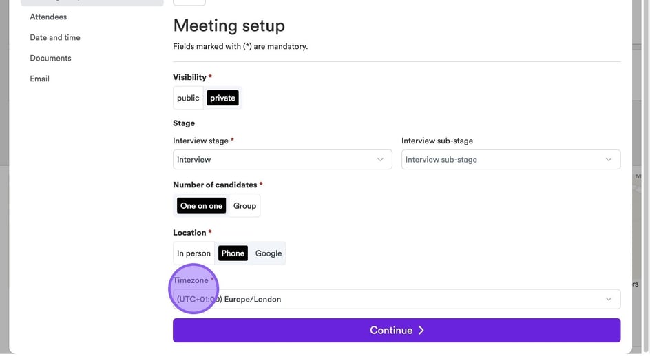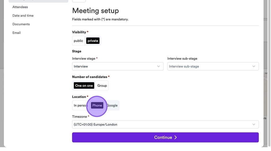 If you select the ‘Phone’ option in the location field, you will be able to select from a timezone. This is the same for the 'Google' and/or 'Teams' option also.