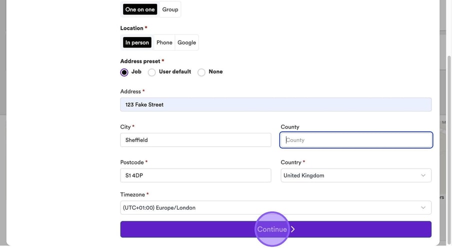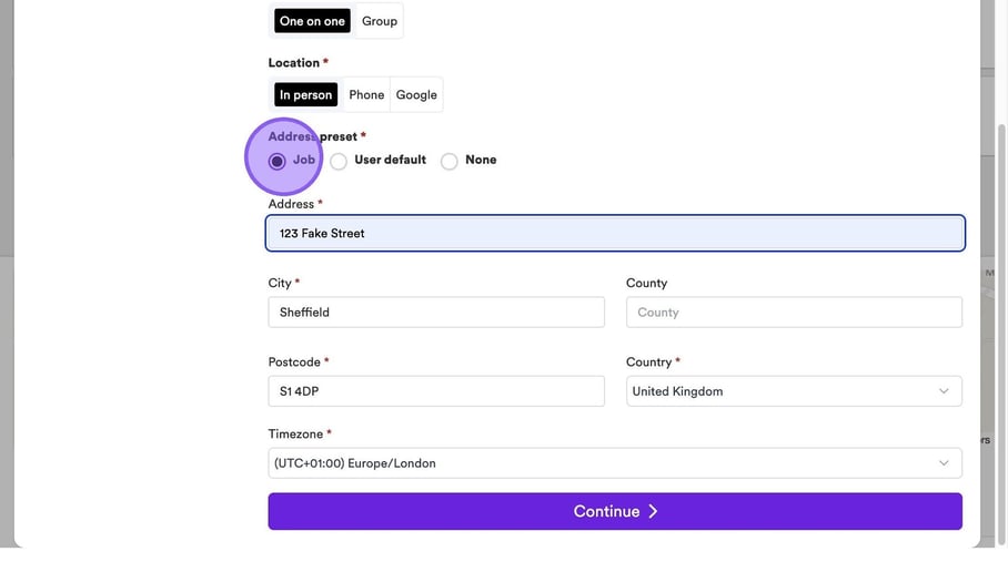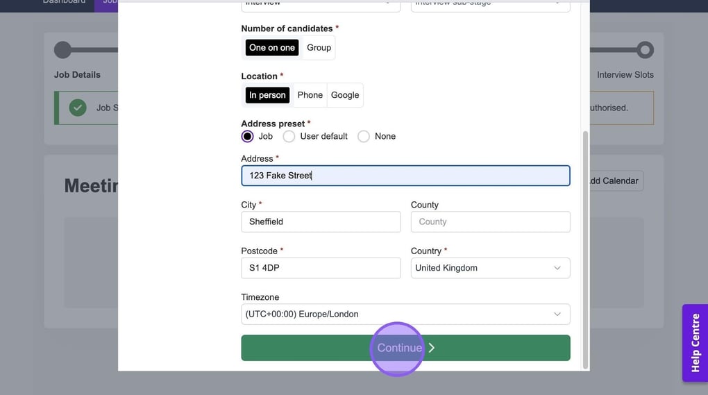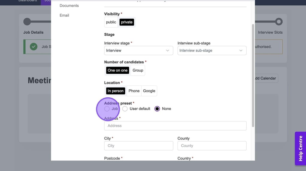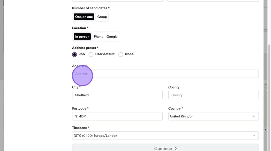 Once you have set the above or if you chose one on one interview you will now need to set the address for your interview. You have the option to either set the address on the job, your user default or none - regardless of which you choose you are still able to amend any fields whether they have been pre-filled or not.