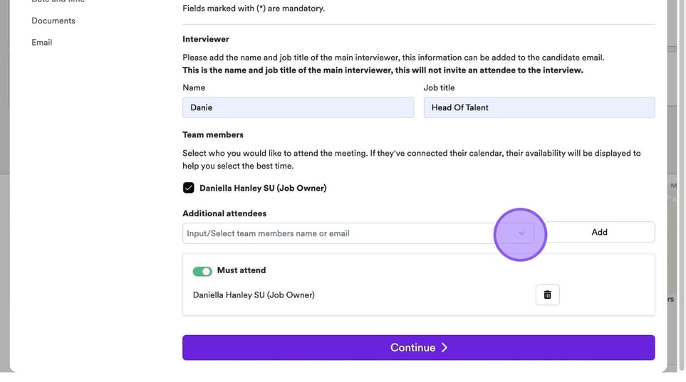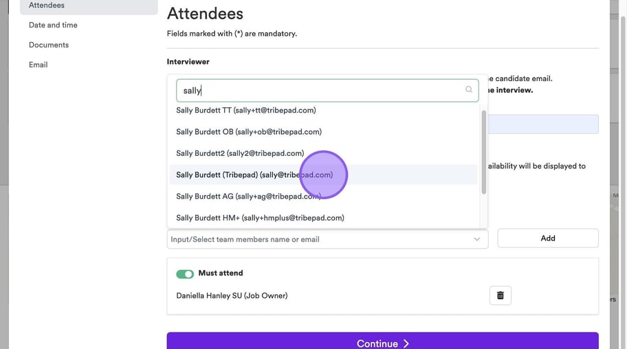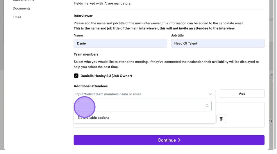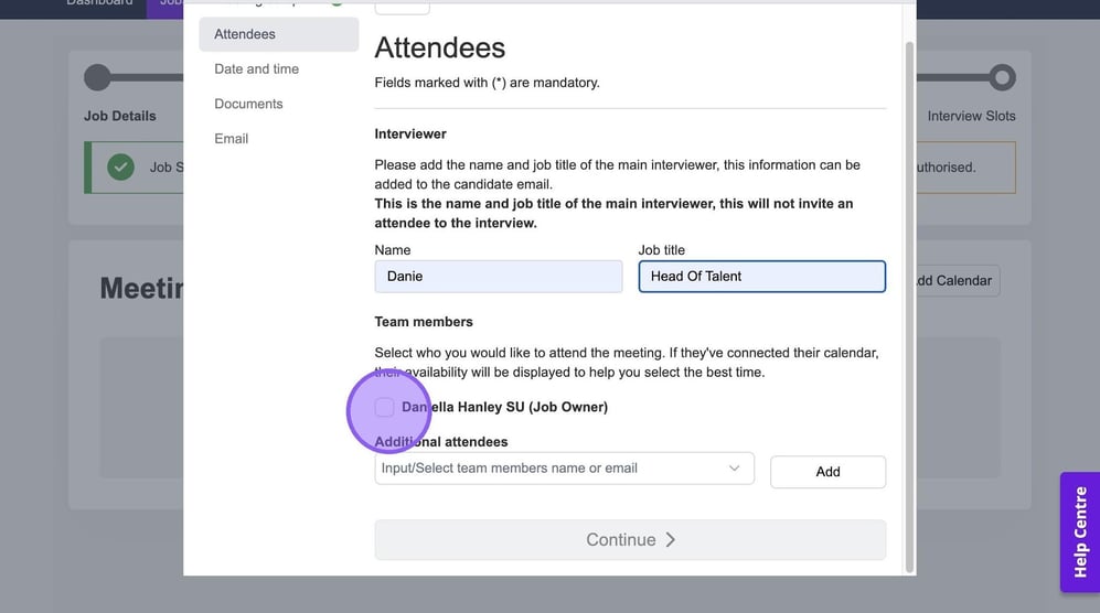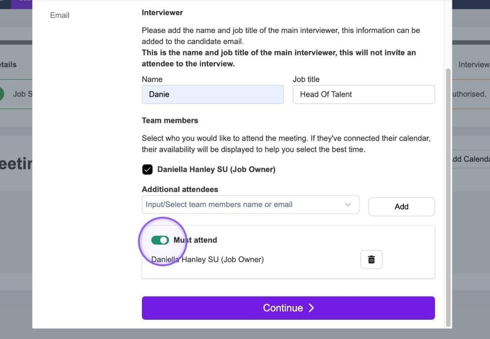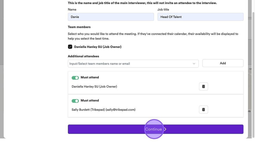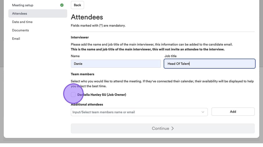 It's now time to add in any additional team members who will be attending your interview. If other colleagues have connected their calendar, you will see them here and be able to select a check box next to their names.