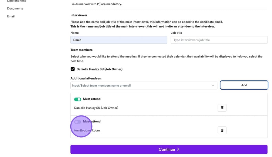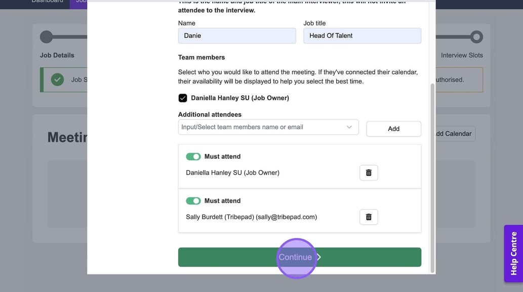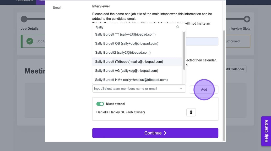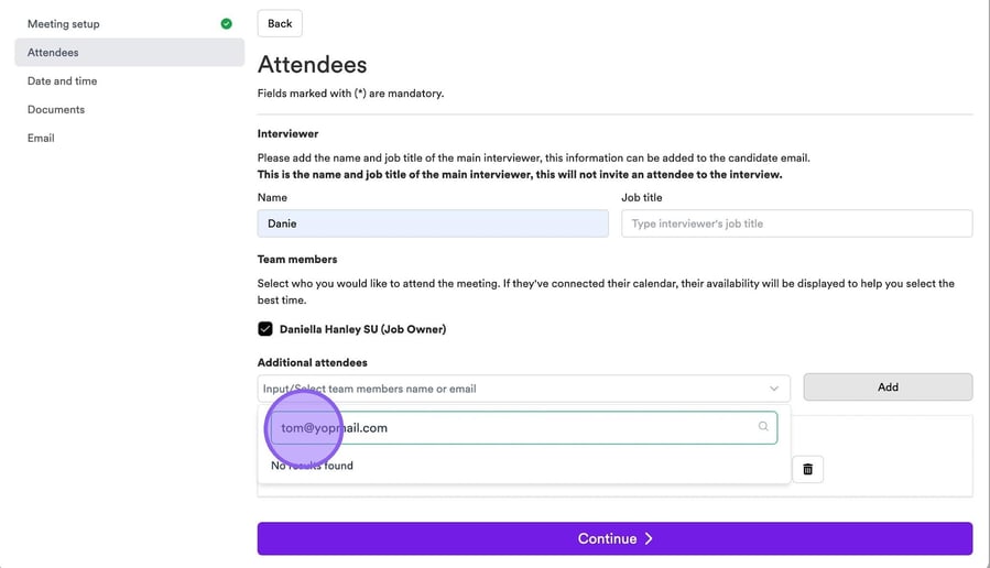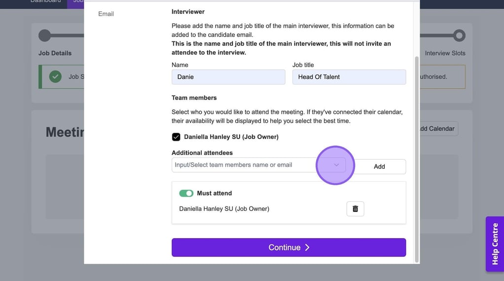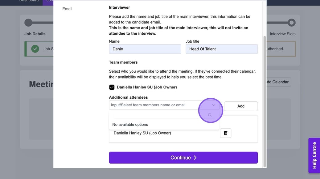 It's now time to add in any additional team members who will be attending your interview. If other colleagues have connected their calendar, you will see them here and be able to select a check box next to their names.