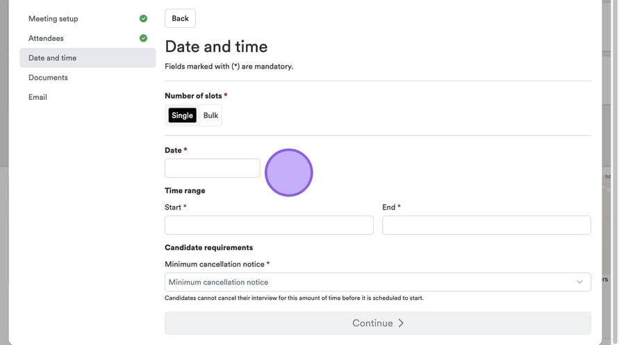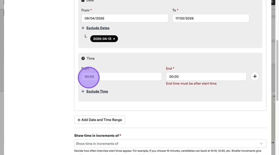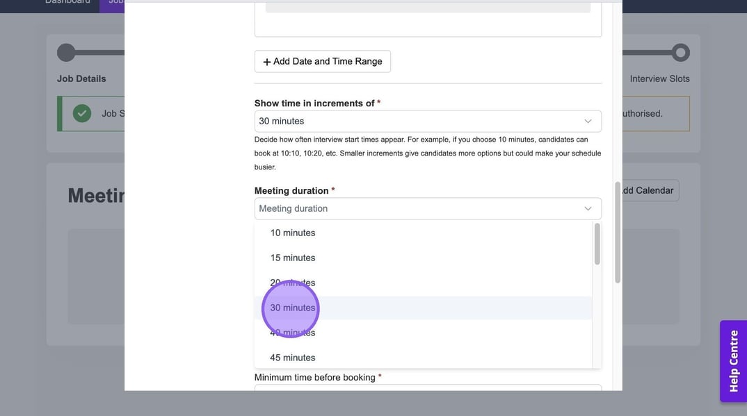 Click "Minimum time before booking" to specify the amount of time a candidate has to book an interview before it's due to start.