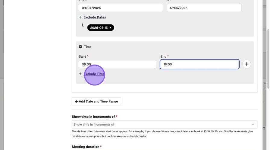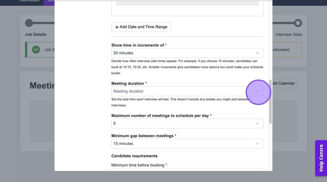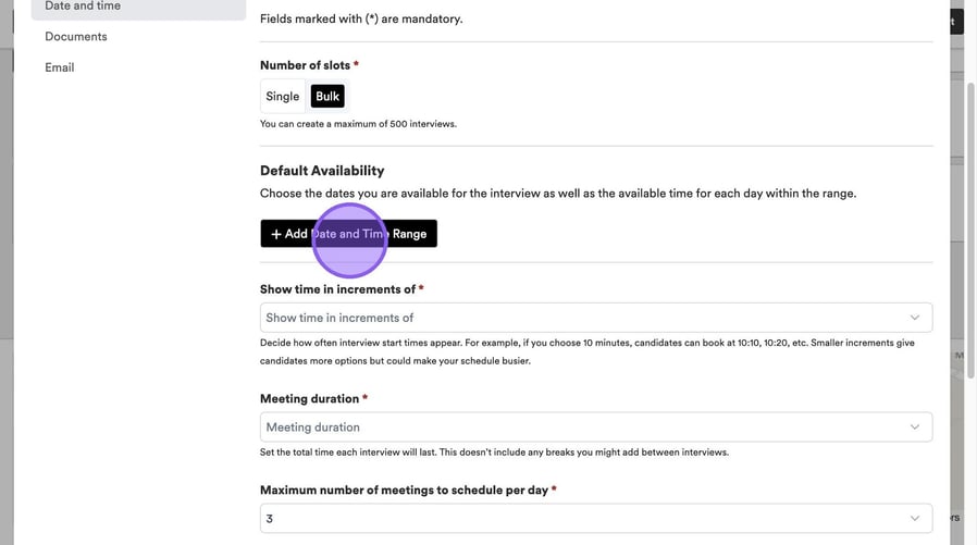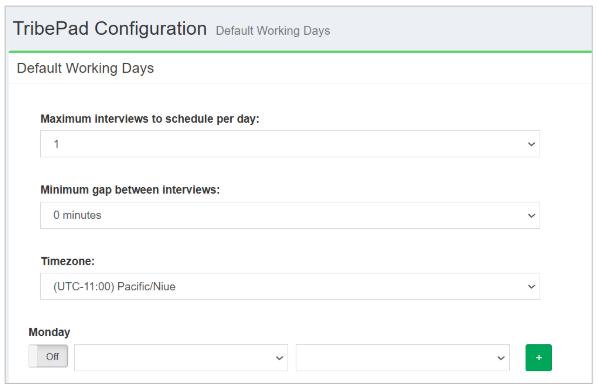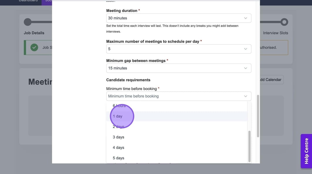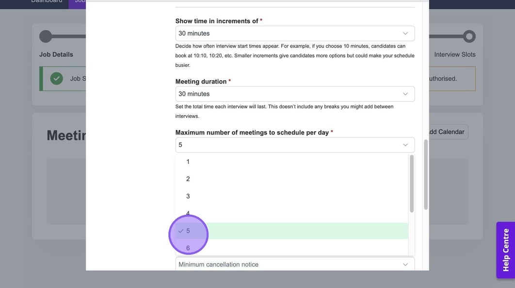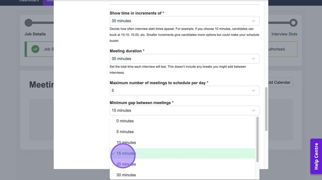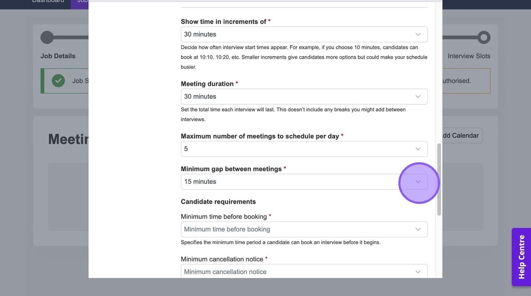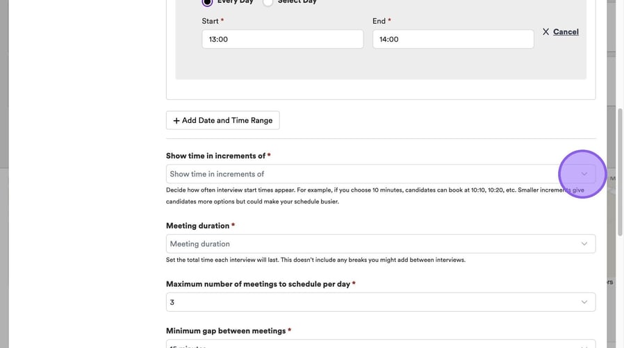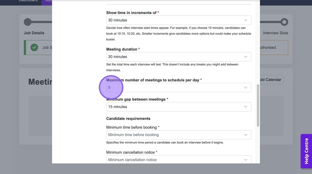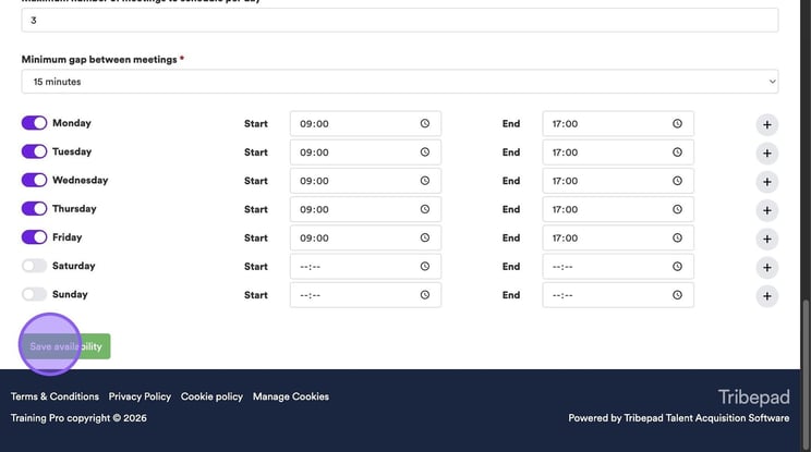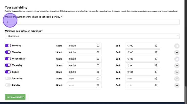 Here you can set the maximum number of meetings to schedule per day and the minimum gap between meetings. If you set these here, these selections will pull through automatically when you're setting up an interview.