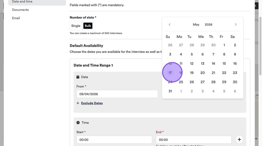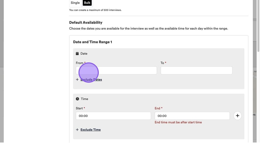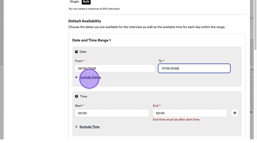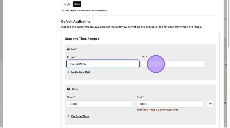 Alternatively, if you select ‘Bulk’ here, you will see a screen that looks like this. Click here to add your date range and time range.