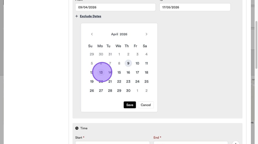 If you would like to exclude any specific dates from your "from" and "to" block of time, click the "Exclude Dates" text here.